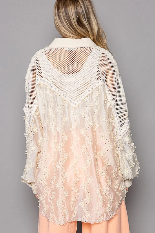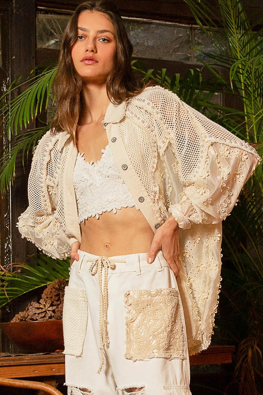 Designed in baloon sleeve regular fit shirt top in textured woven with see through crochet patch, out seam detail, pearl trim point, metal button down, edge cut detail, vintage washing.