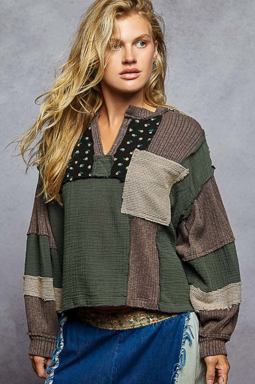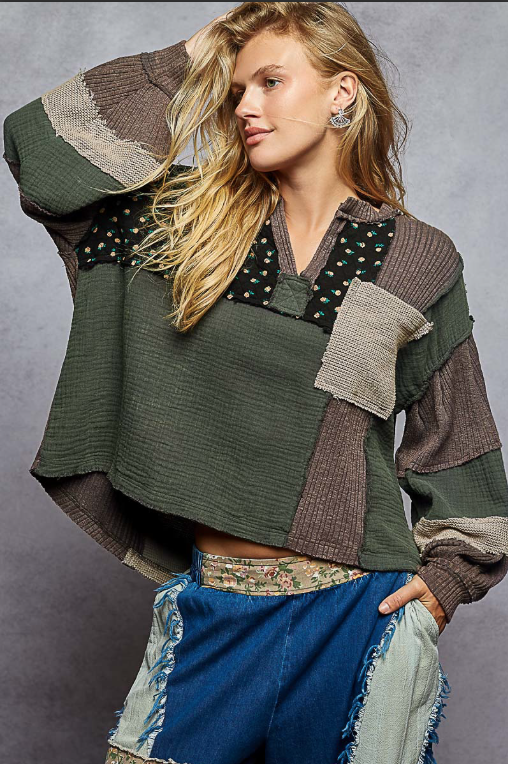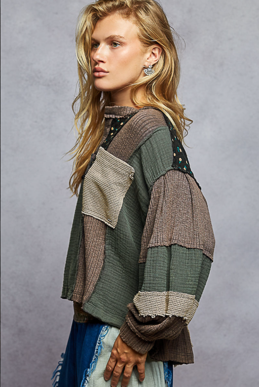 Designed in round neck balloon sleeve oversized fit top in double gauze with quilting contrast.