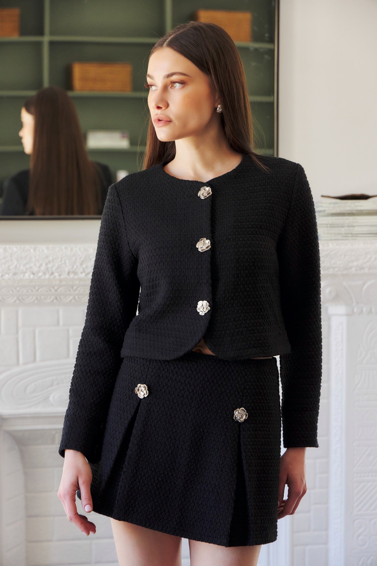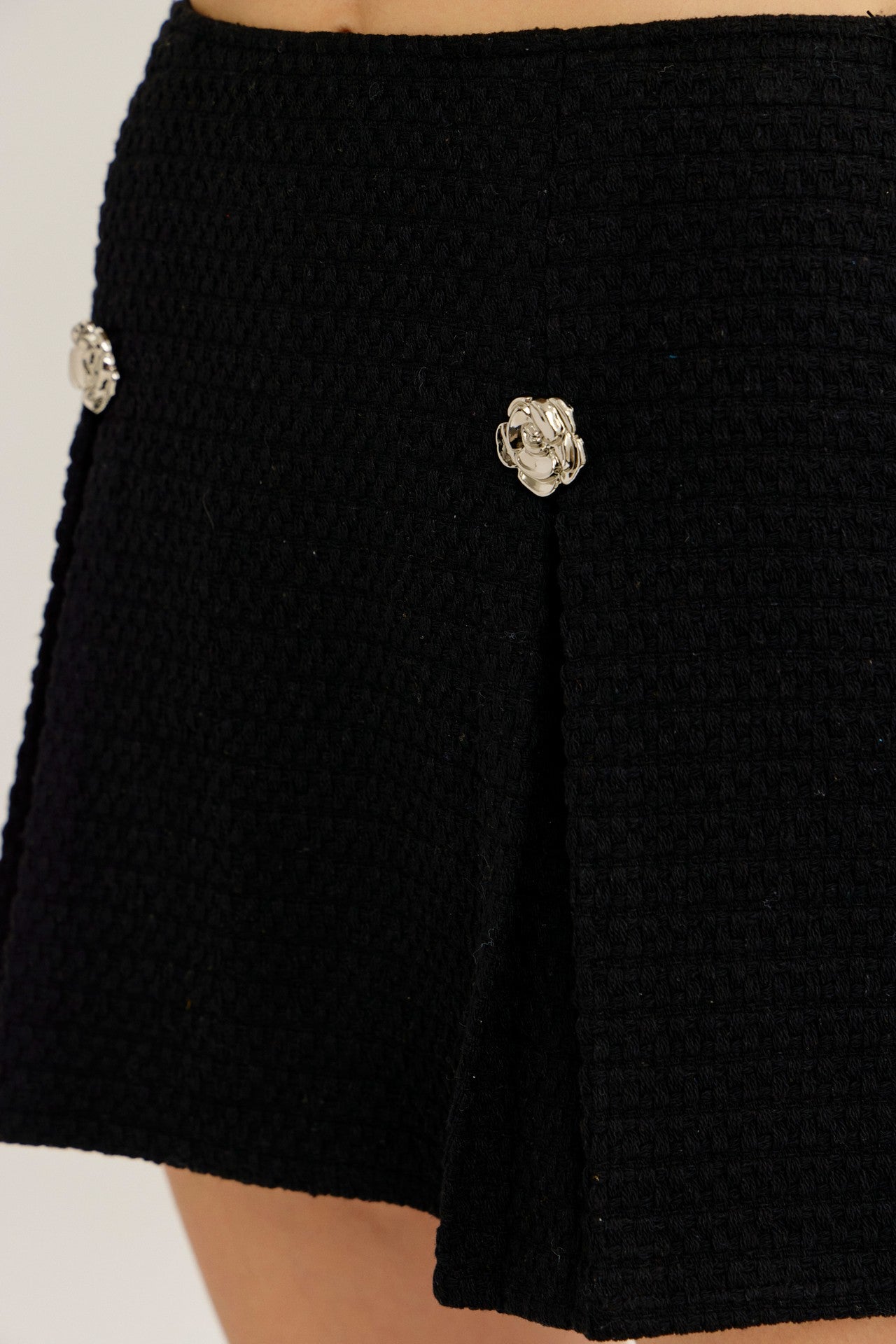 Pleated tweed skort with built-in shorts and back zip closure. Features decorative rosette buttons at the front. Pairs perfectly with matching jacket our Benny Jacket