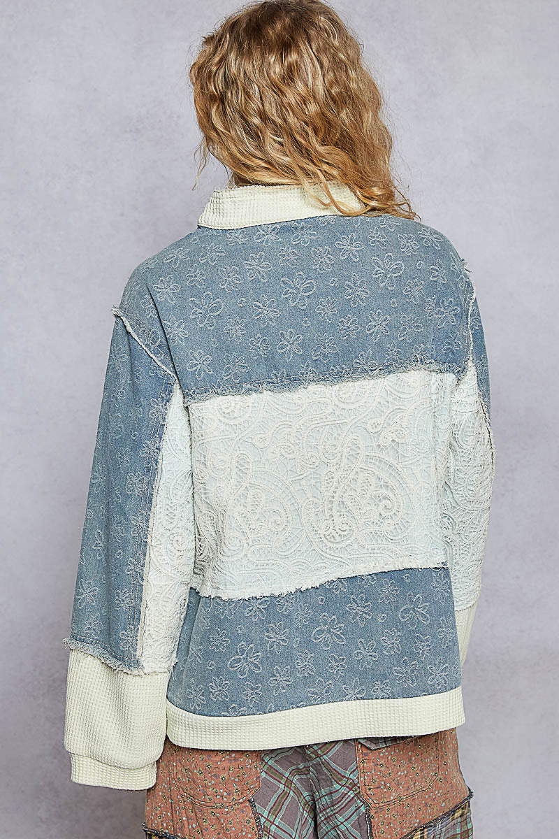 top in twill and crochet lace mix with raw edge detail Pointed solid pattern
