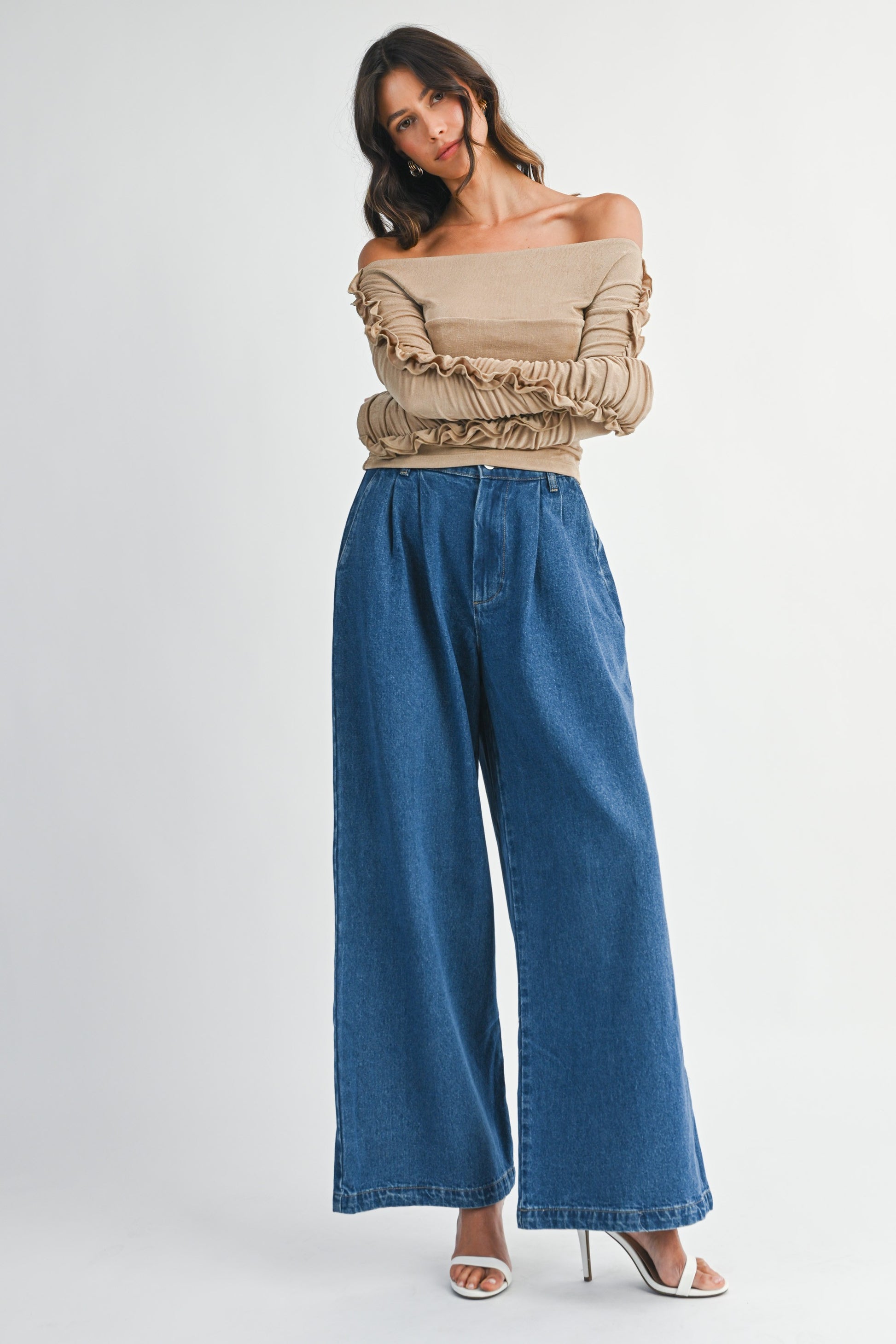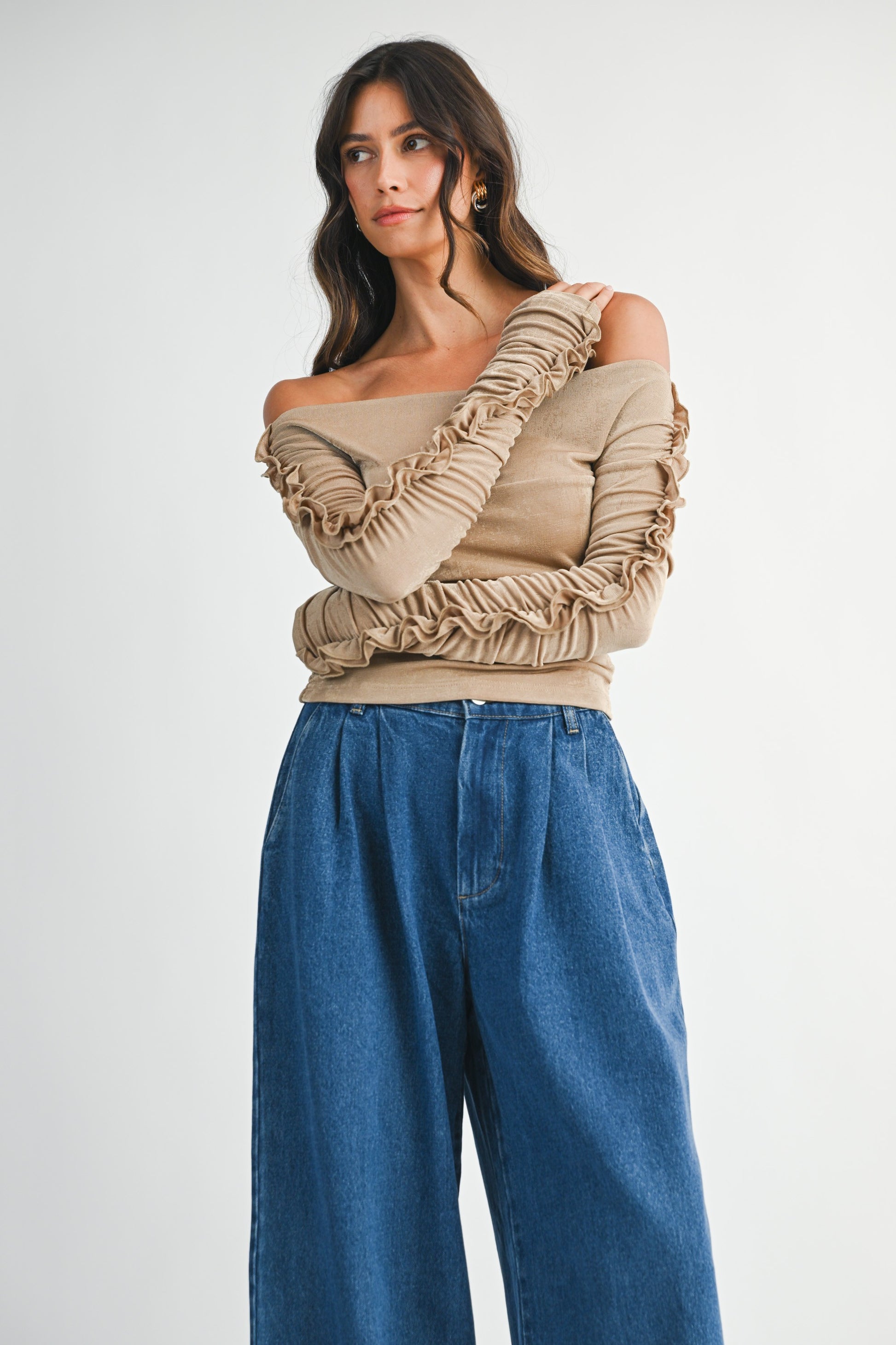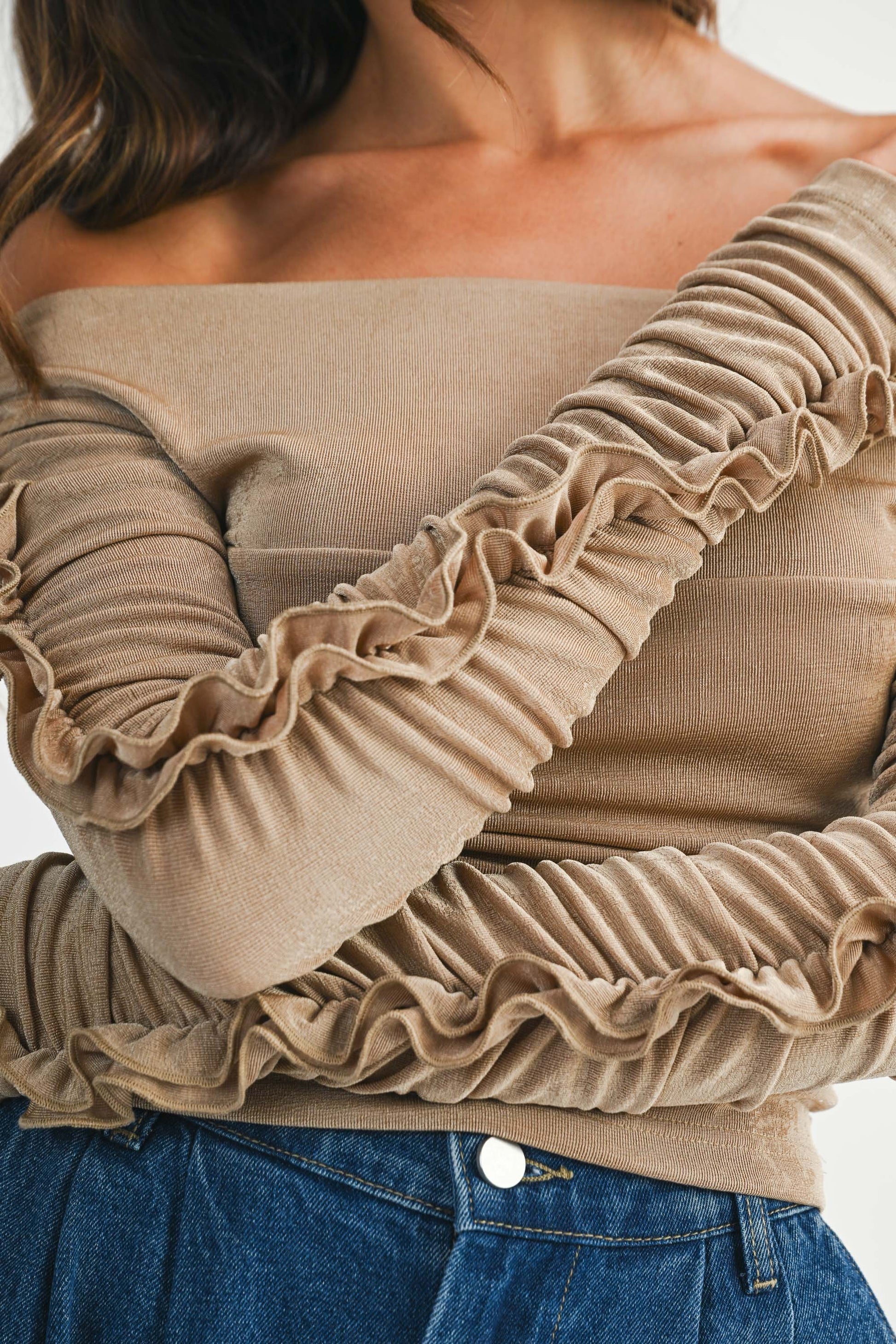 Off-the-shoulder solid slinky knit fabric ruched long sleeve with ruffle-edge sleeve detail top.