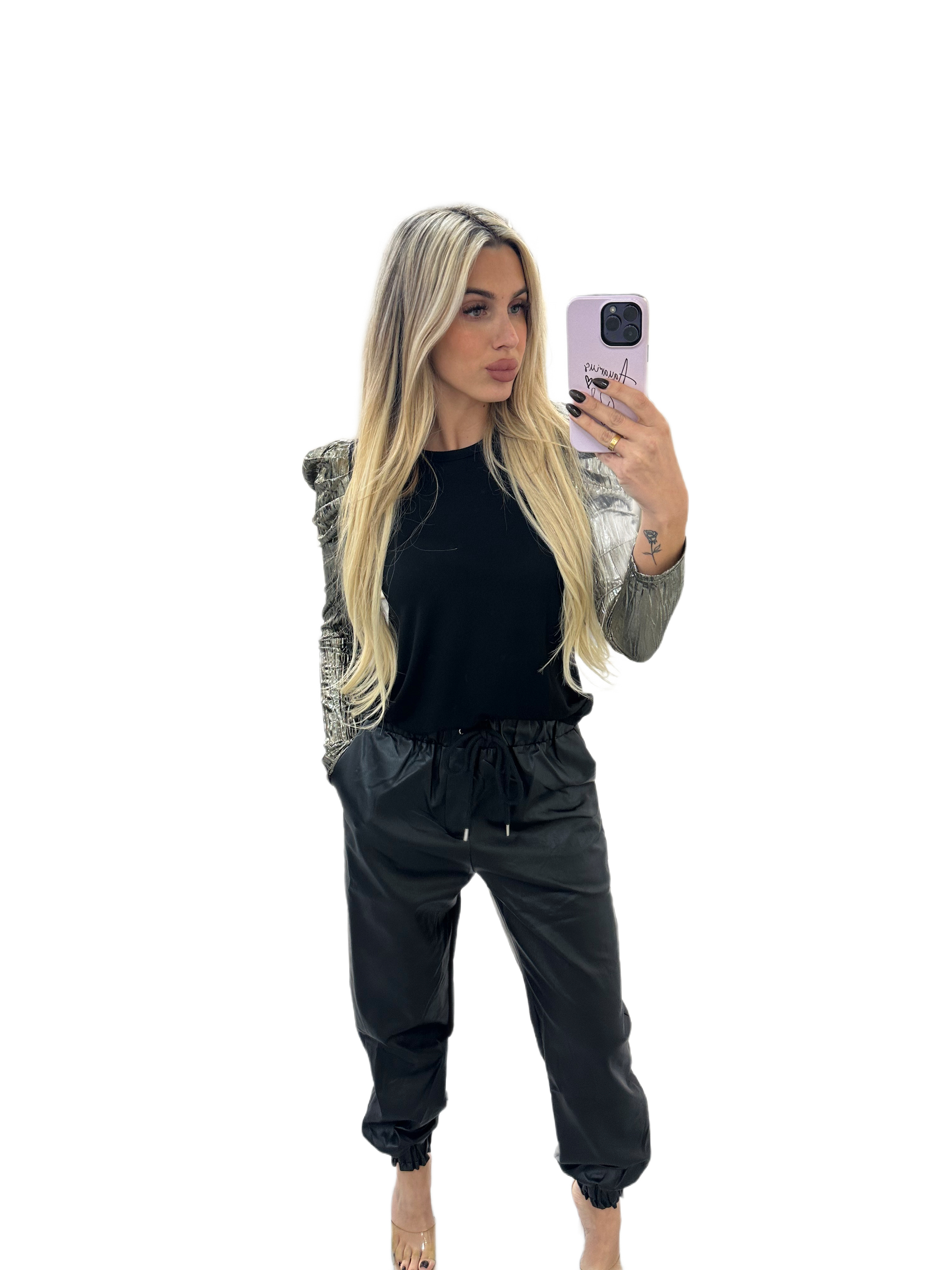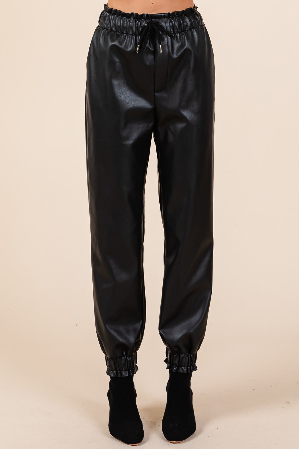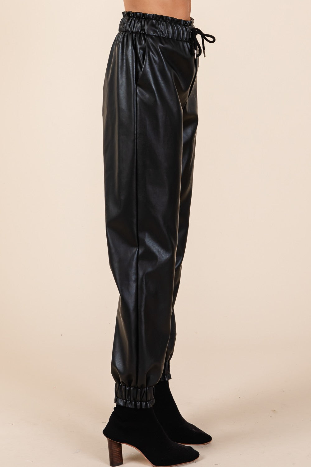 Faux leather high-waisted jogger pants with elastic waist and lining inside.