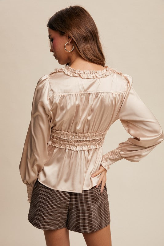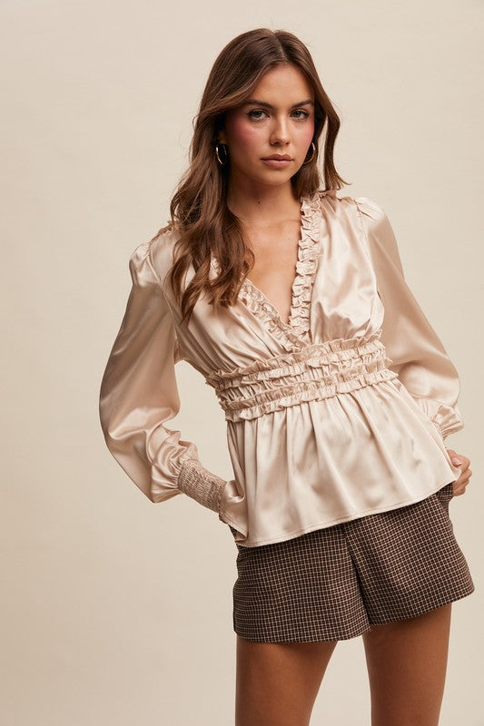 - Satin ruffled V-neck long sleeves blouse - V-neck with ruffle detail - Stretched - Long sleeves with smocking ruffle cuffs - Elastic ruffle on waist - Finished with clean hem - Model is 5' 7.5" 33-24-34 and wearing a size Small