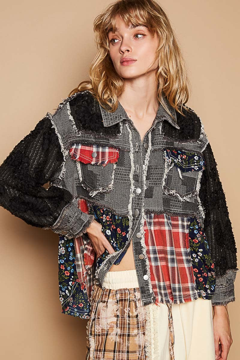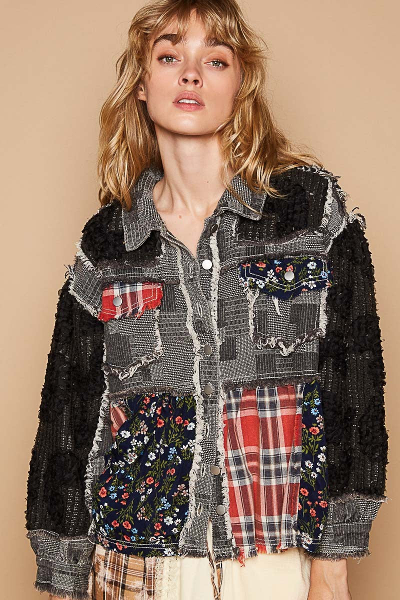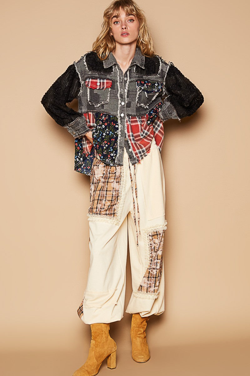 Designed in placket jacekt, balloon sleeve, A-line fit top in twill and crochet lace mix with raw edge detail pointed solid pattern.