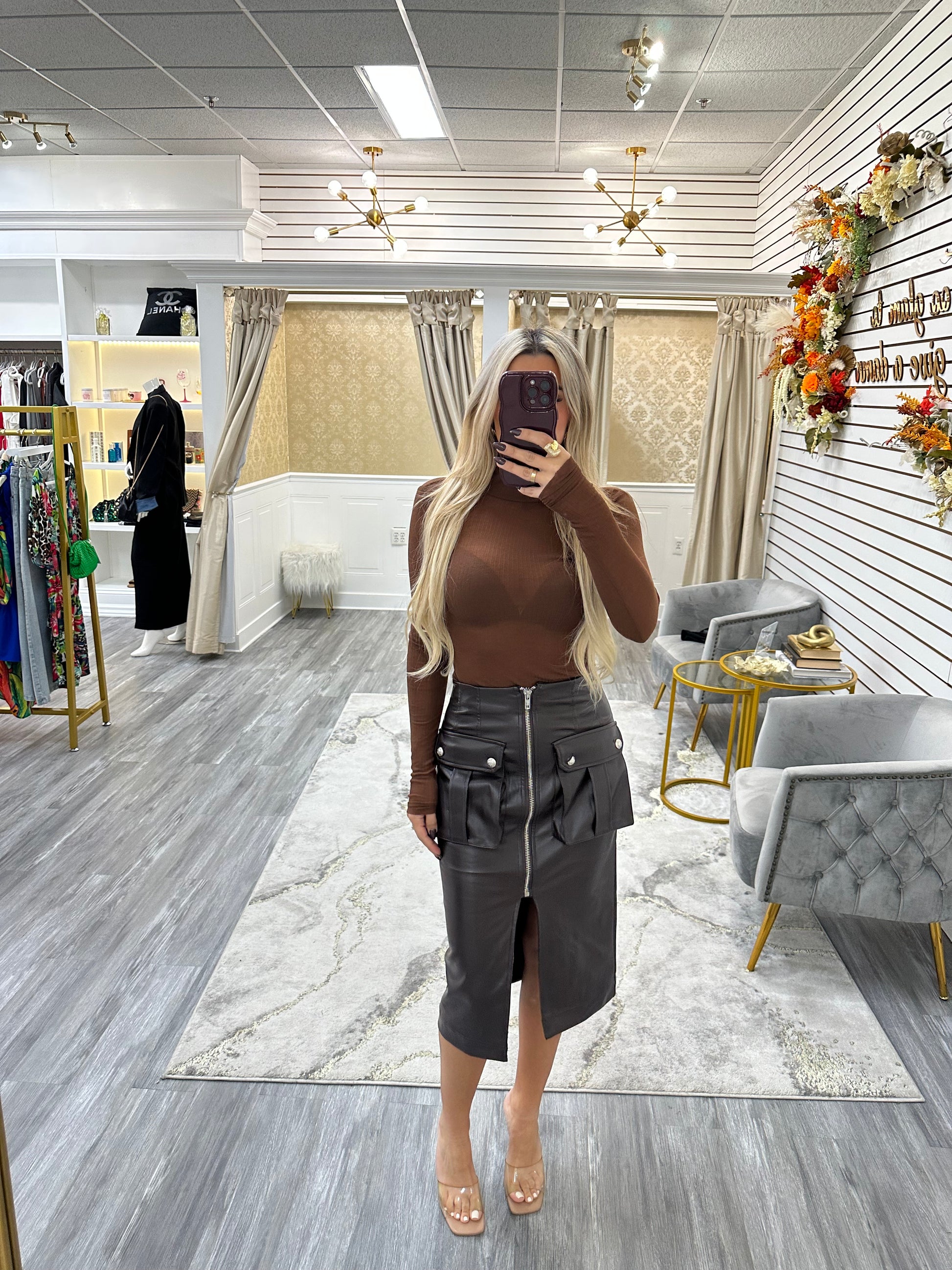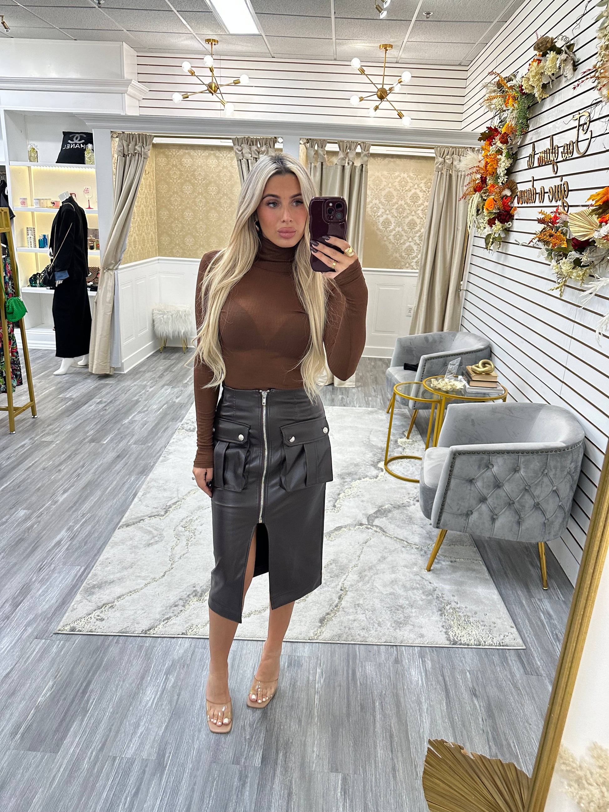 Our Dominique Pu Skirt features a zipper front closure and a slit