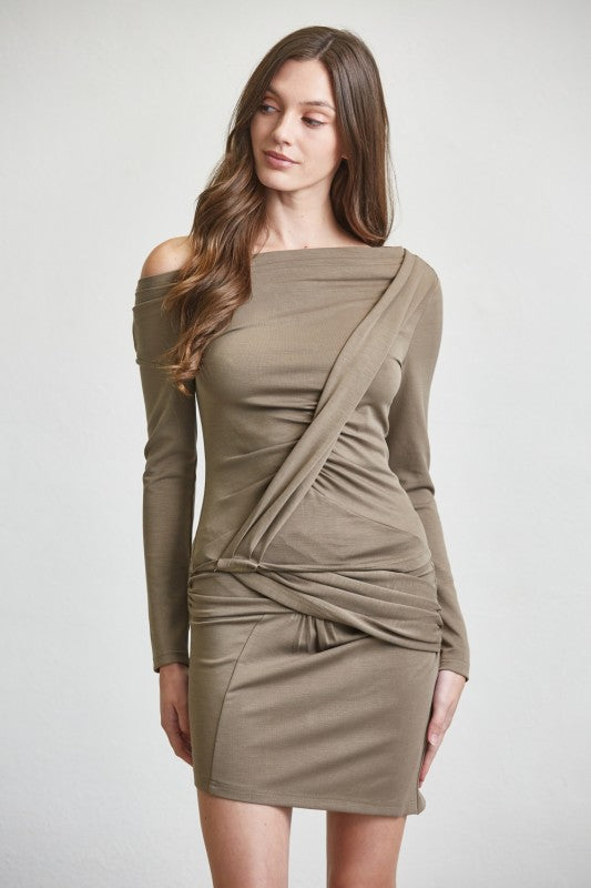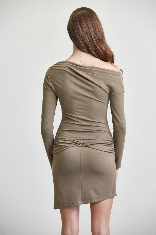 A soft knit off-shoulder top designed with a modern draped effect that highlights the neckline and waist. The asymmetrical foldover neckline creates a clean, elongated look, while the gathered side seams shape the silhouette for a flattering, body-skimming finish. The front crossover drape adds texture and dimension without bulk, giving the piece a refined yet comfortable feel. With its stretchy knit construction and sculpted long sleeves, this top blends an elegant neckline with contemporary detailing, making it versatile for day-to-night styling or paired as a coordinated set with the matching skirt. - Soft stretch knit with body-skimming fit - Off-shoulder foldover neckline - Asymmetrical drape detail at front - Side gathering creates shape and texture - Long sleeves with clean finish