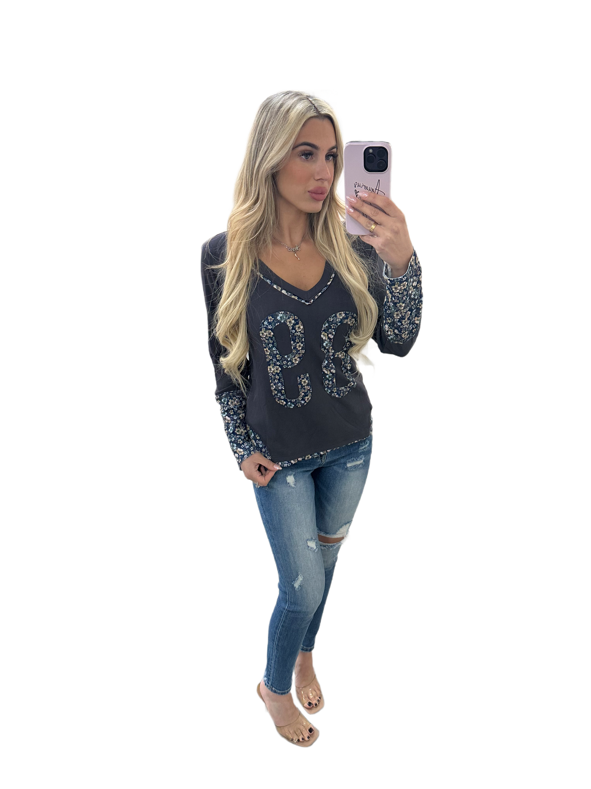 Designed in V-neck long sleeve regular fit top in rib with out seam, floral print number patch, panel neck band seam sewing point, vintage washing, solid color.