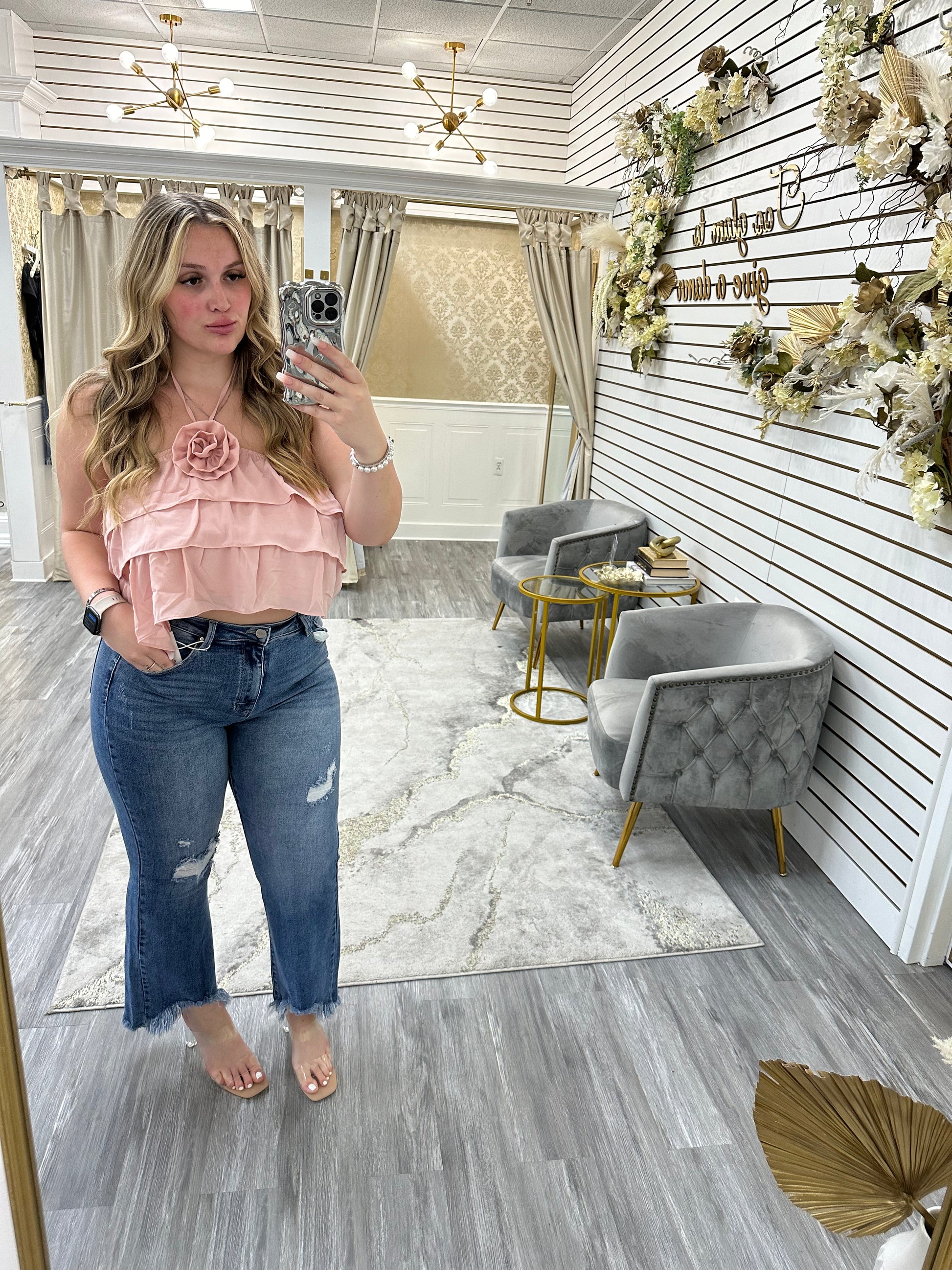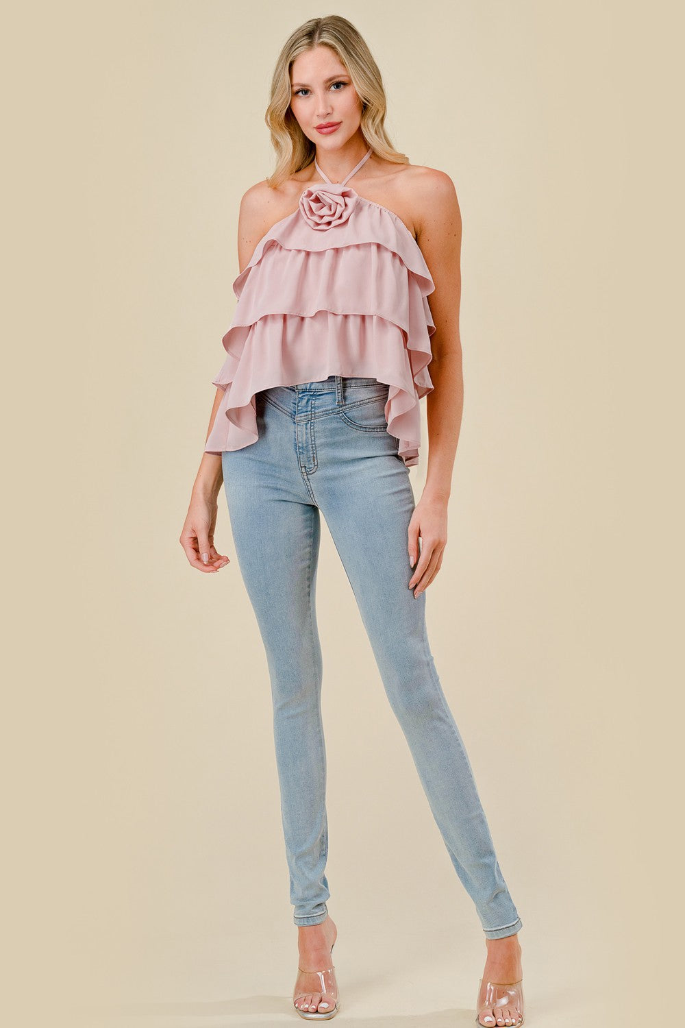 ROSE CORSAGE ROSETTE HALTER NECK RUFFLED TIERED TOP SELF:100%POLYESTER LINING:88%POLYESTER 12%SPANDEX