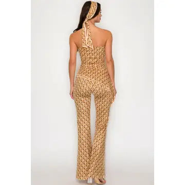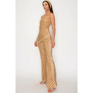 -Strapless jumpsuit with all-over geometric print -Ruched waist detail for enhanced shape and definition -Soft and highly stretchable fabric for comfortable wear -Elasticized bust waistband -Scarf-style band can be worn as a hair band for versatile styling | Size + Fit | Model is 5'7" and wearing size Small