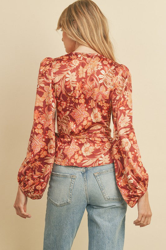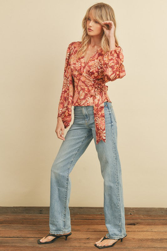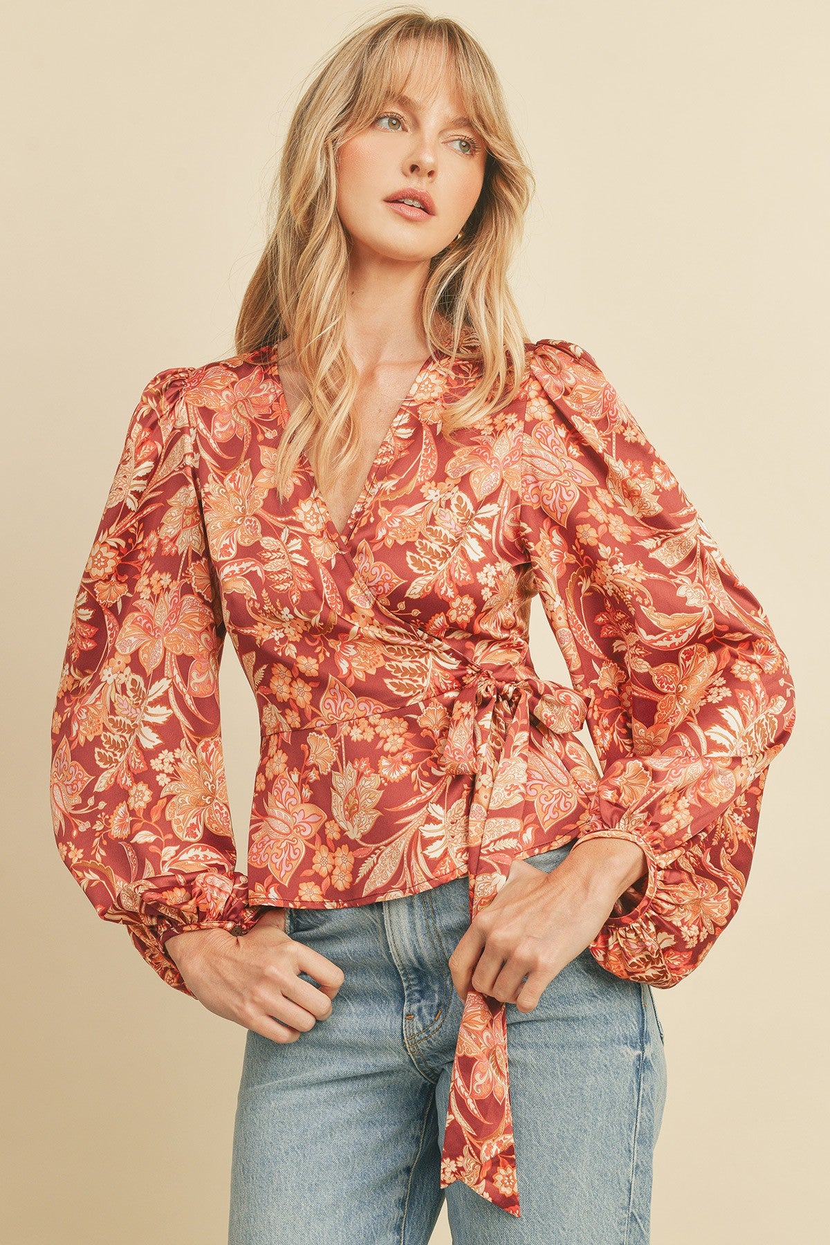 PAISLEY FLORAL WRAP TOP WITH PLEATED SHOULDERS, RUCHING DETAILS ON SLEEVE OPENINGS, AND TIE CLOSURES. UNLINED. MODEL IS 5'9" AND WEARING SIZE SMALL. SHELL: 95% POLYESTER, 5% SPANDEX