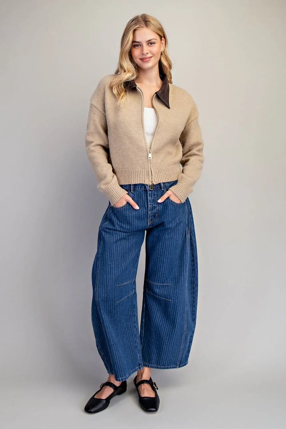 This jacket features a cozy knit body with a contrasting faux leather collar, a functional two way front zipper, dropped shoulders, long sleeves with ribbed cuffs, and a ribbed hem for a polished yet relaxed fit.