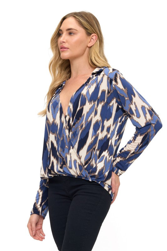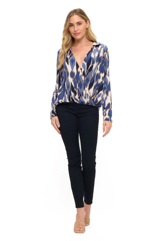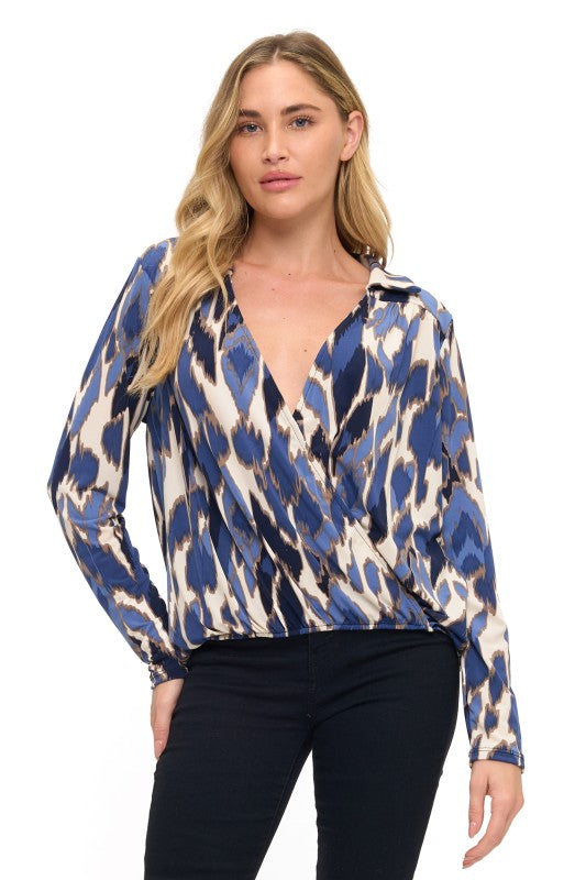 PRINTED COLLARED SURPLICE TOP