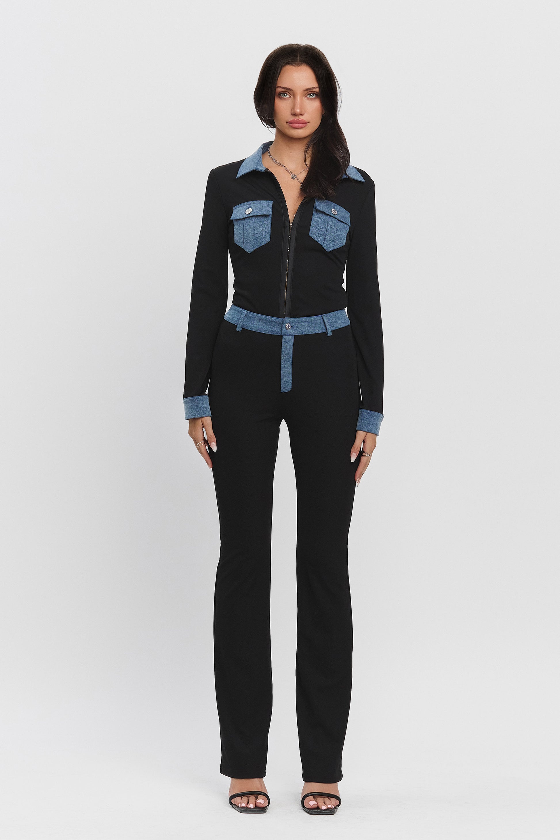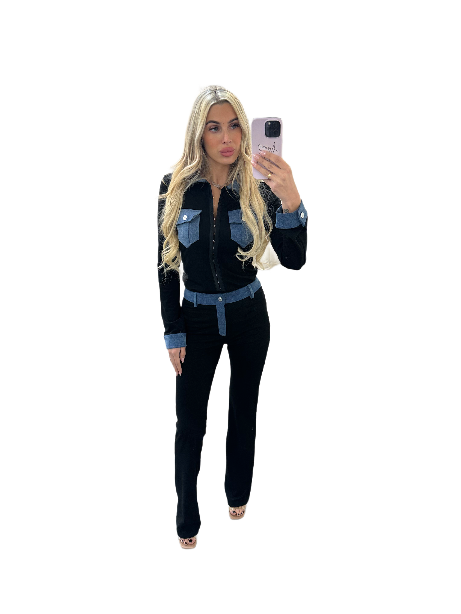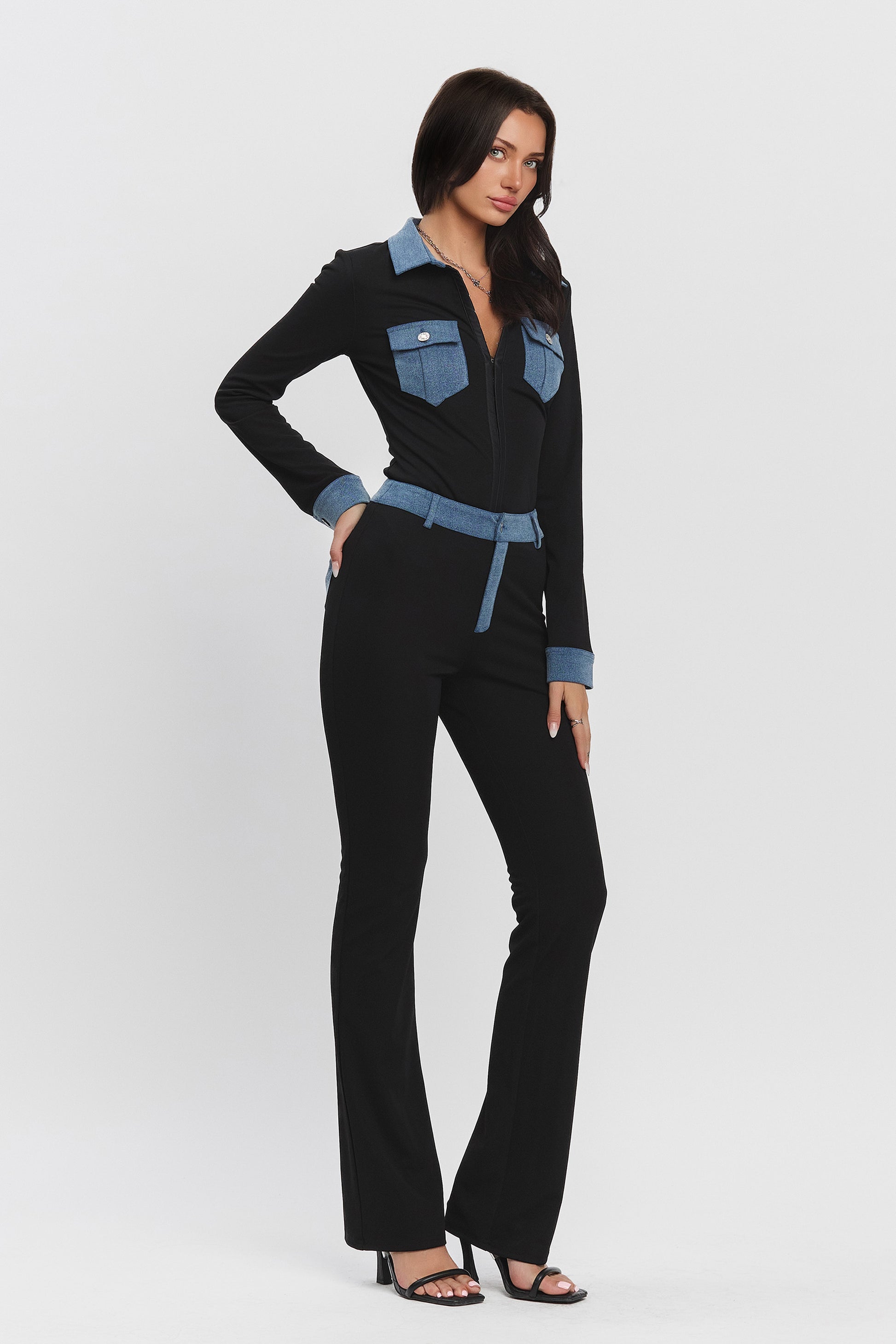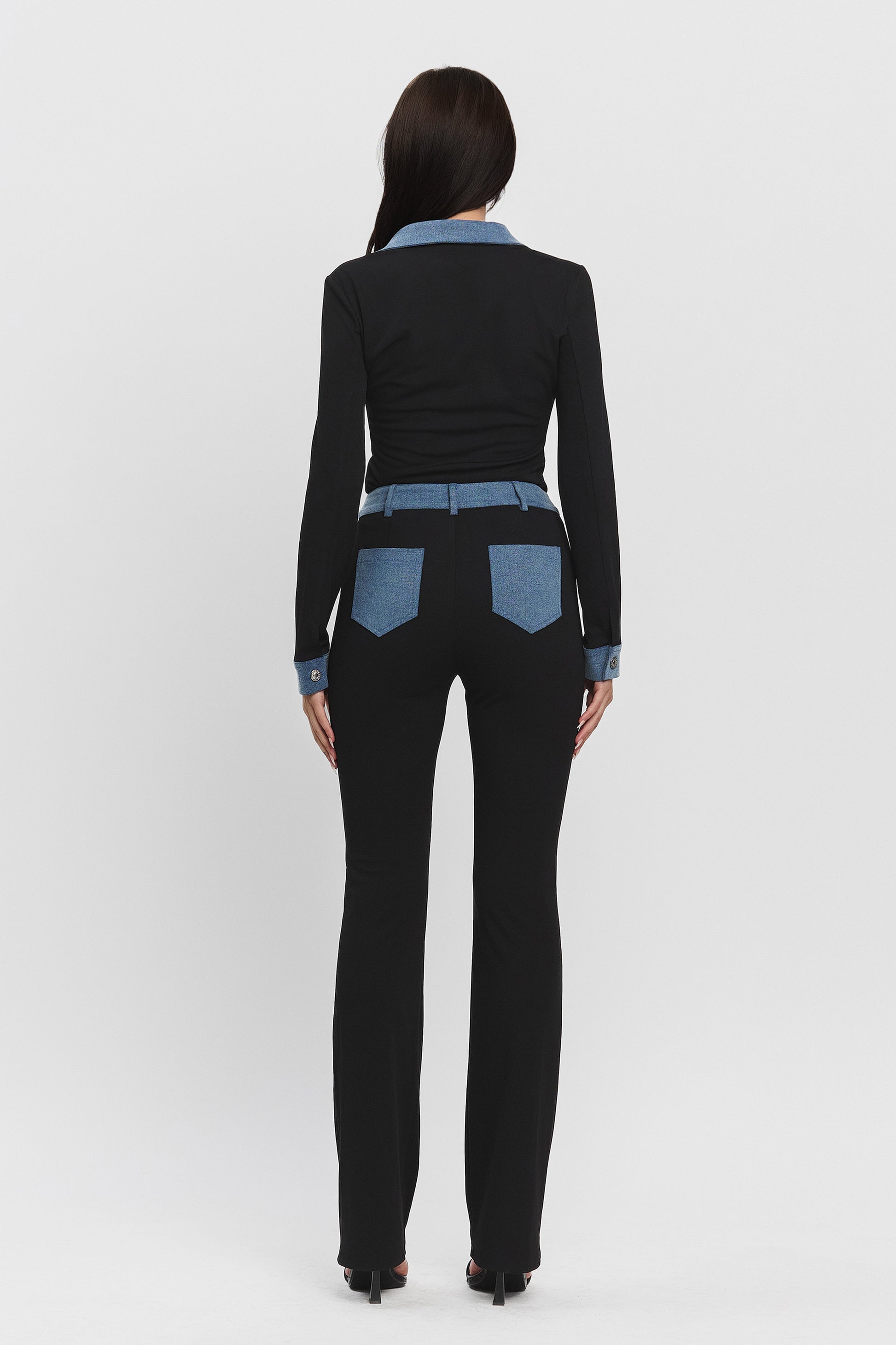 - Stretch woven w/ denim contrast pant - Denim contrast details - Flared pants - Good stretch - Model size 5' 9"