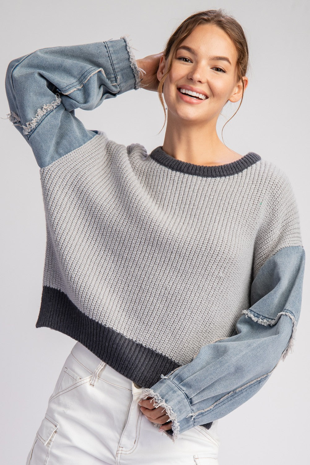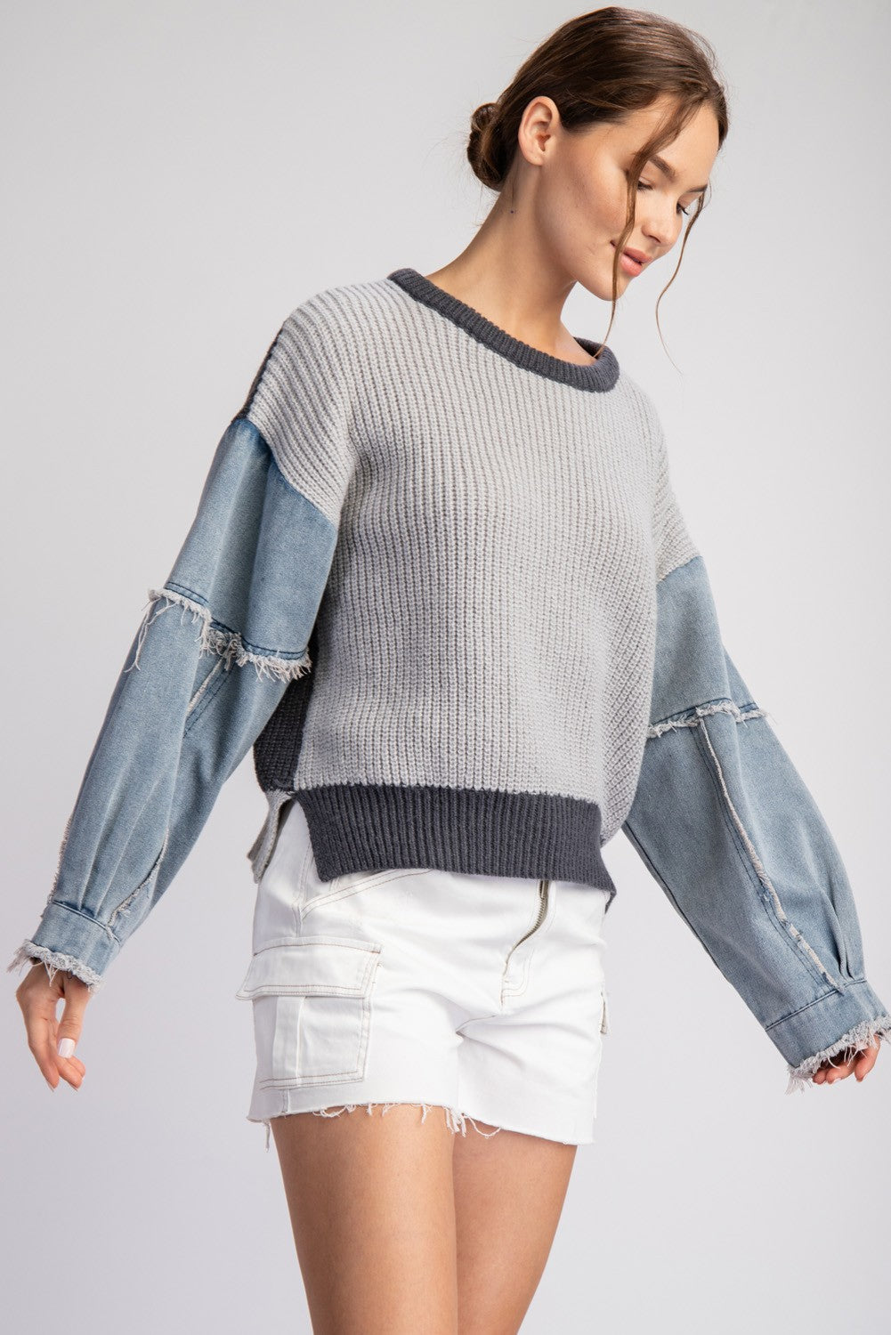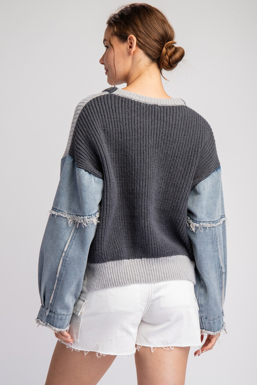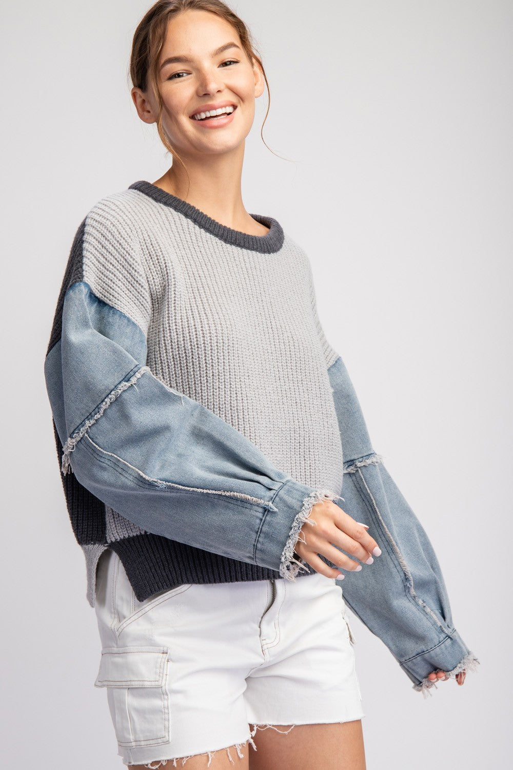 Mineral washed long sleeve sweater top featuring a two toned round neckline, dropped shoulders, denim sleeves with added seams and fraying for detail, a two toned bottom band, side slits and is a relaxed fit.