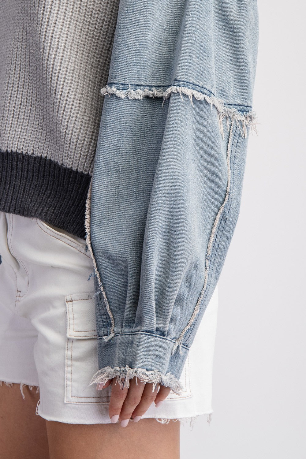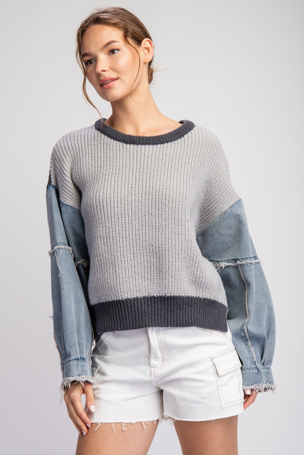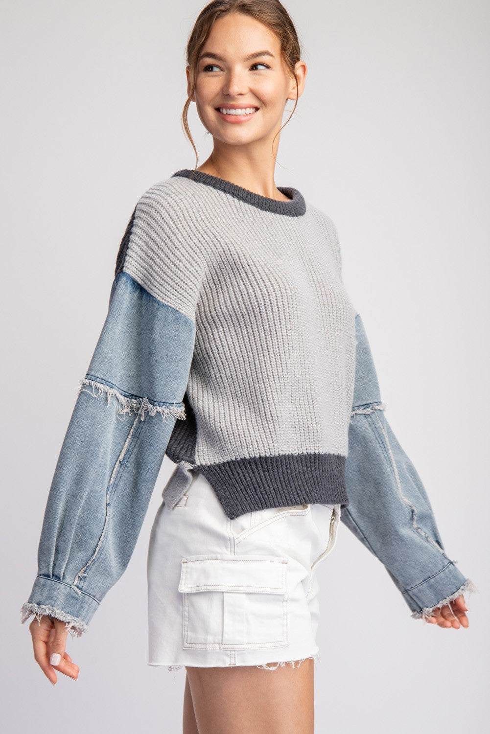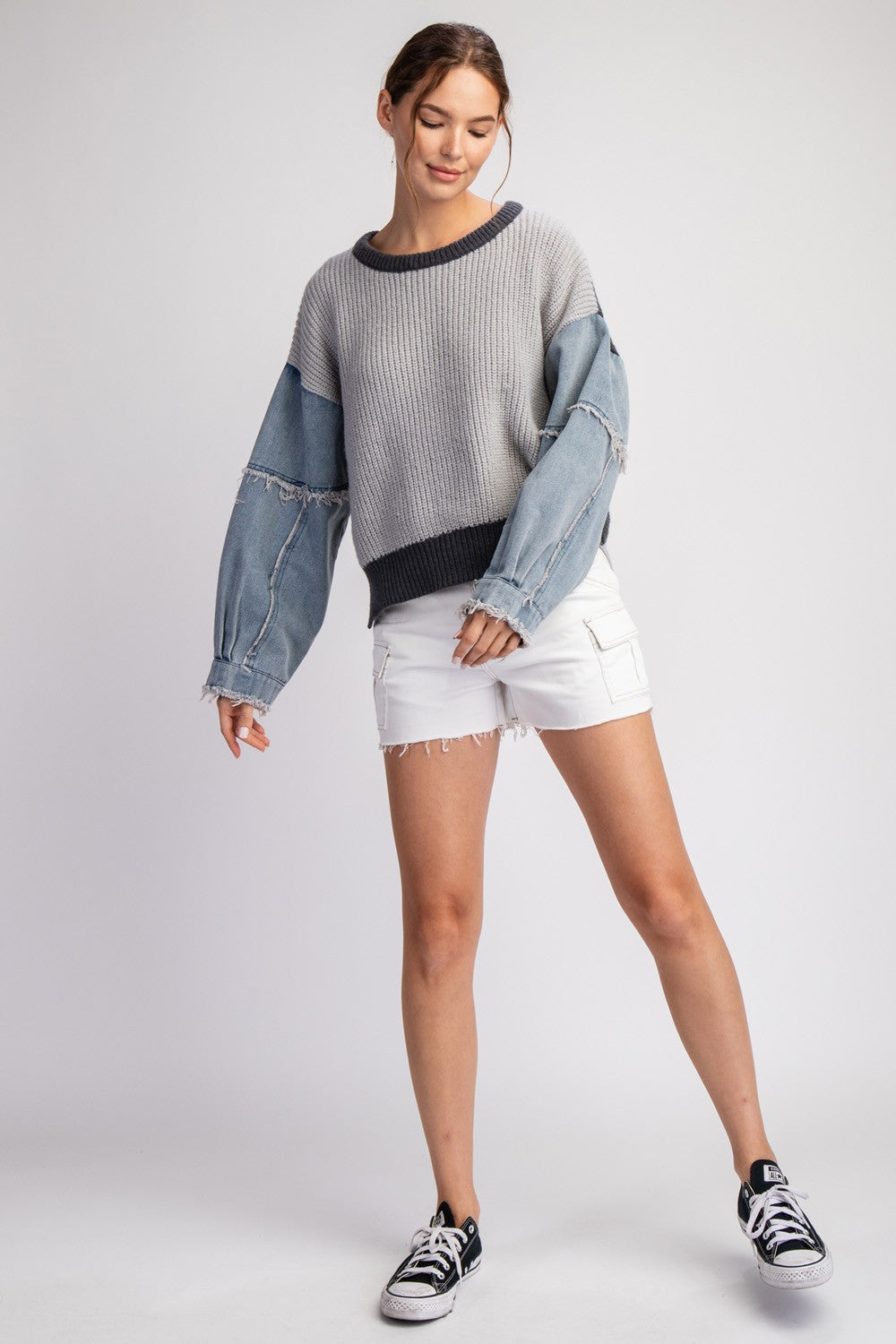 Mineral washed long sleeve sweater top featuring a two toned round neckline, dropped shoulders, denim sleeves with added seams and fraying for detail, a two toned bottom band, side slits and is a relaxed fit.