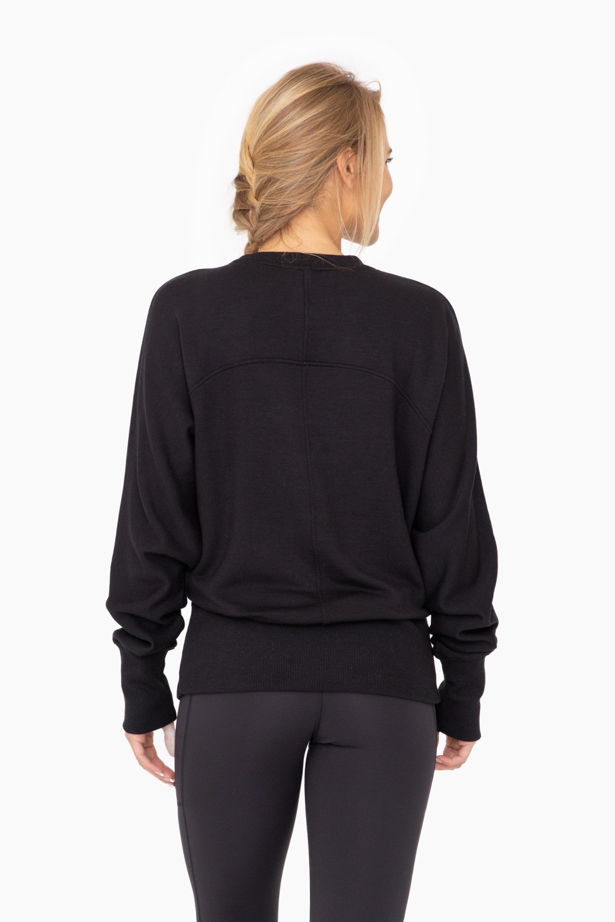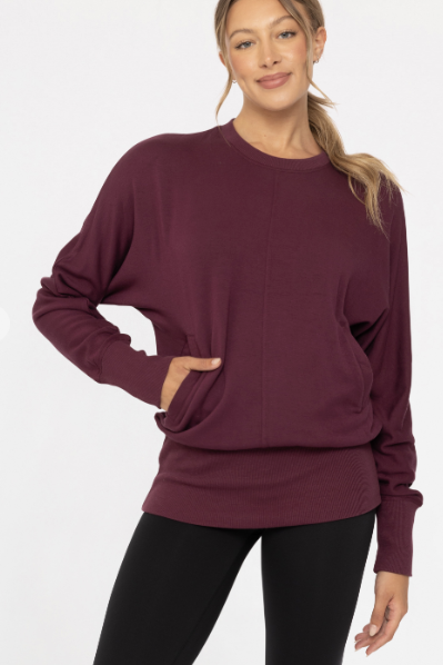 Experience the perfect combination of comfort and style. This long sleeve crew neck is crafted with a lightweight rayon blend fleece and brushed inner for maximum coziness. It features dolman sleeves, a kangaroo pocket, and an extra wide ribbed band at the hem. Lauren, is 5'7"and is wearing an S 67% rayon 18% polyester 10% cotton 5% spandex