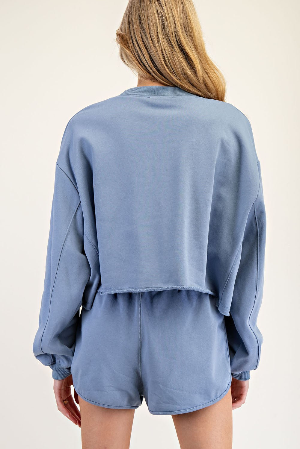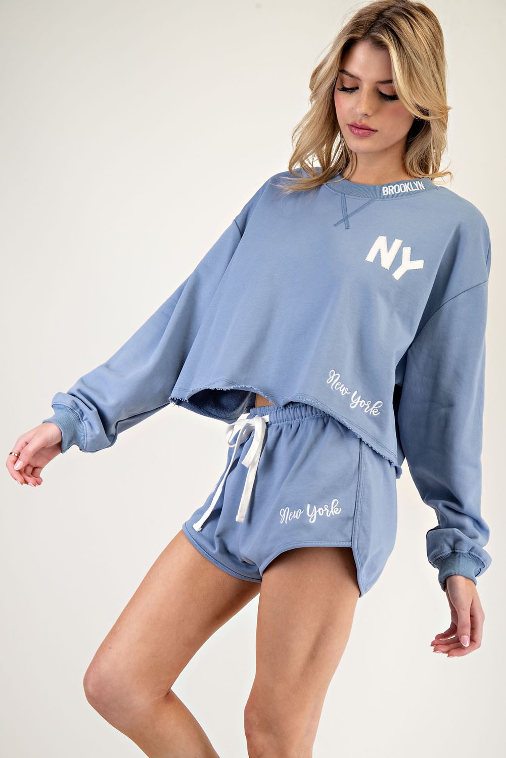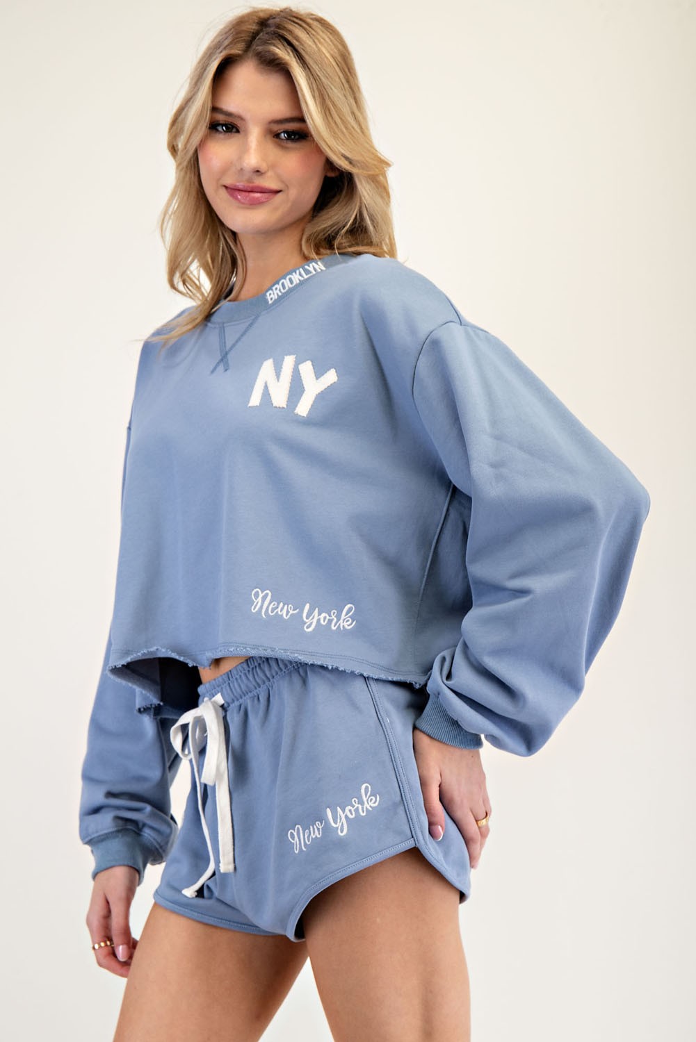 Long sleeve pullover top featuring a ribbed round neckline with Brooklyn text detailing, dropped shoulders, banded cuffs, NY text on the front, is a raw bottom hem and is a cropped length.