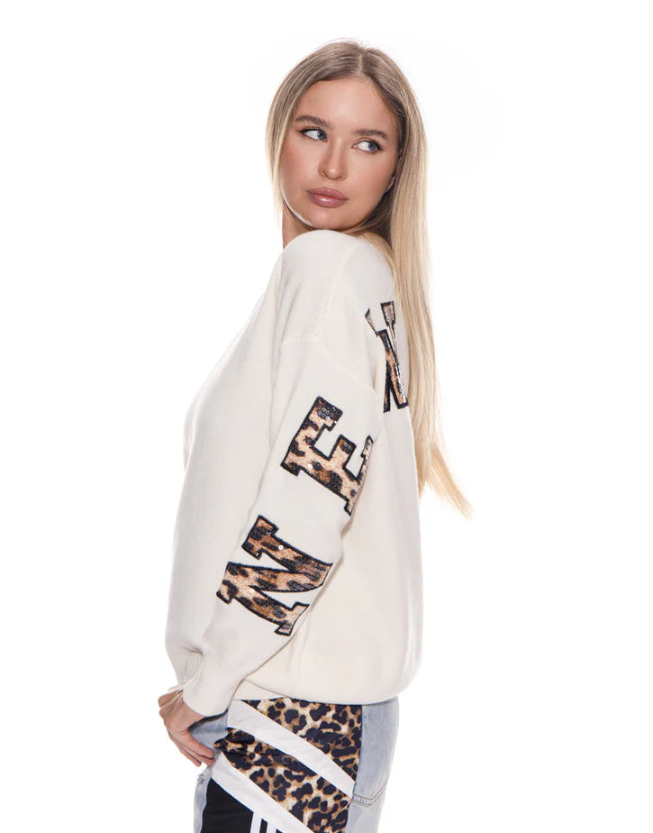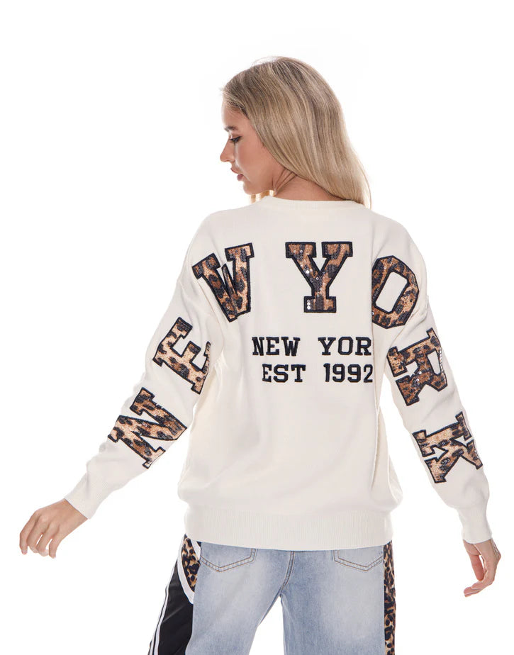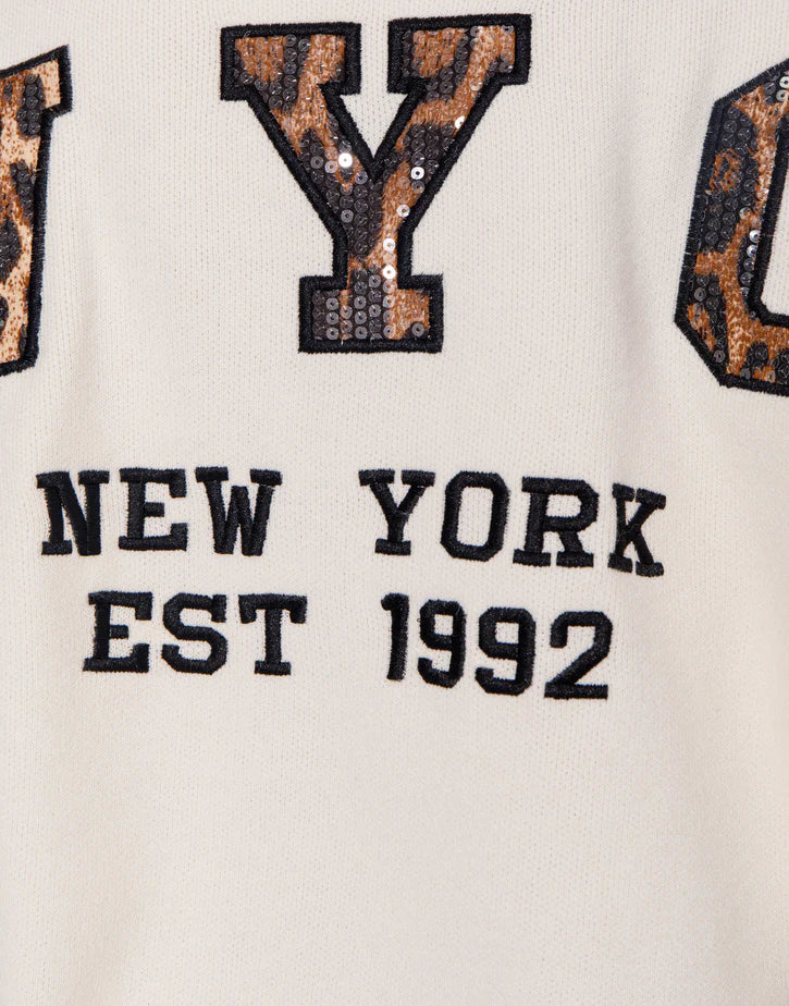 Cream crewneck sweatshirt with NEW YORK around back and sleeves with sequin