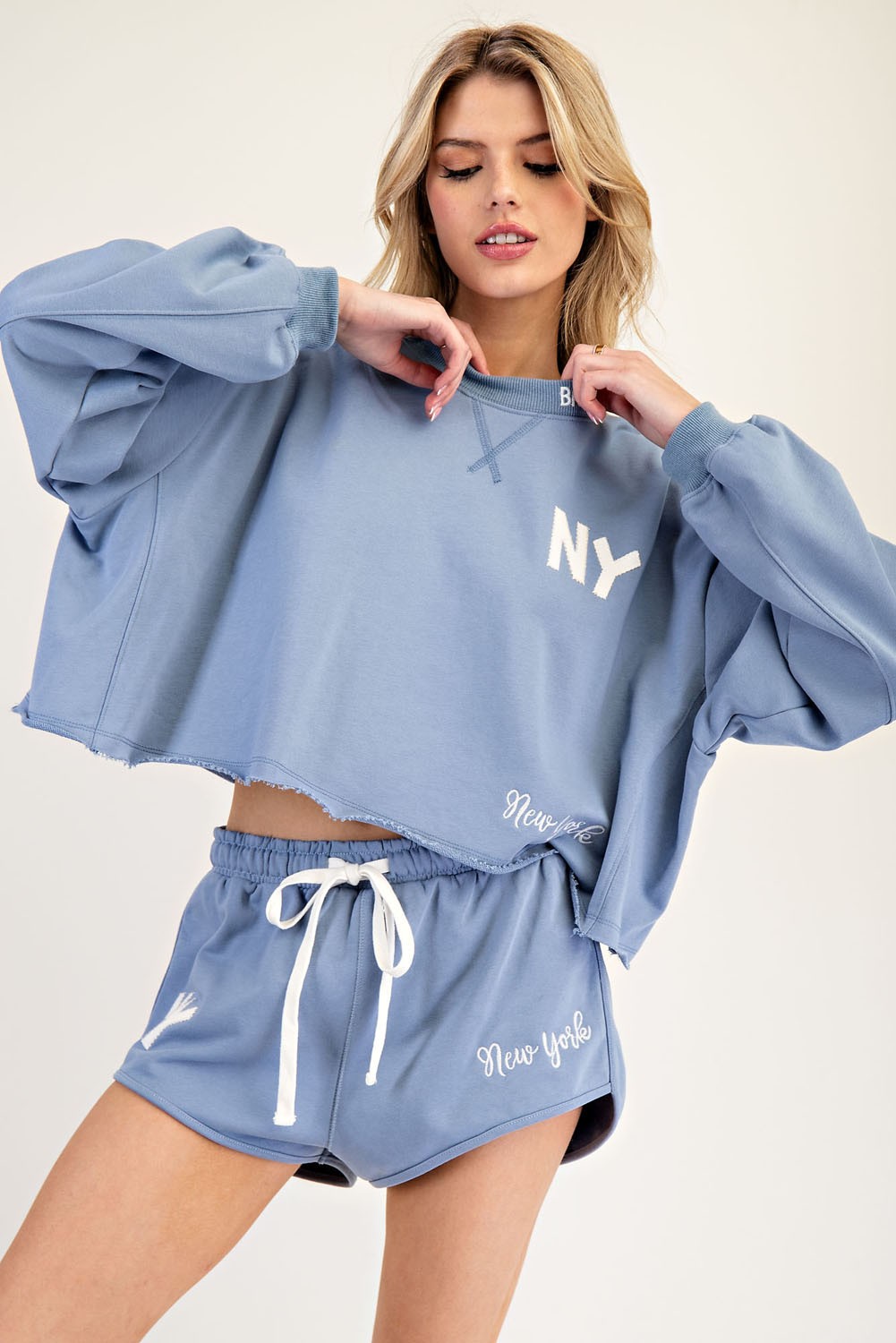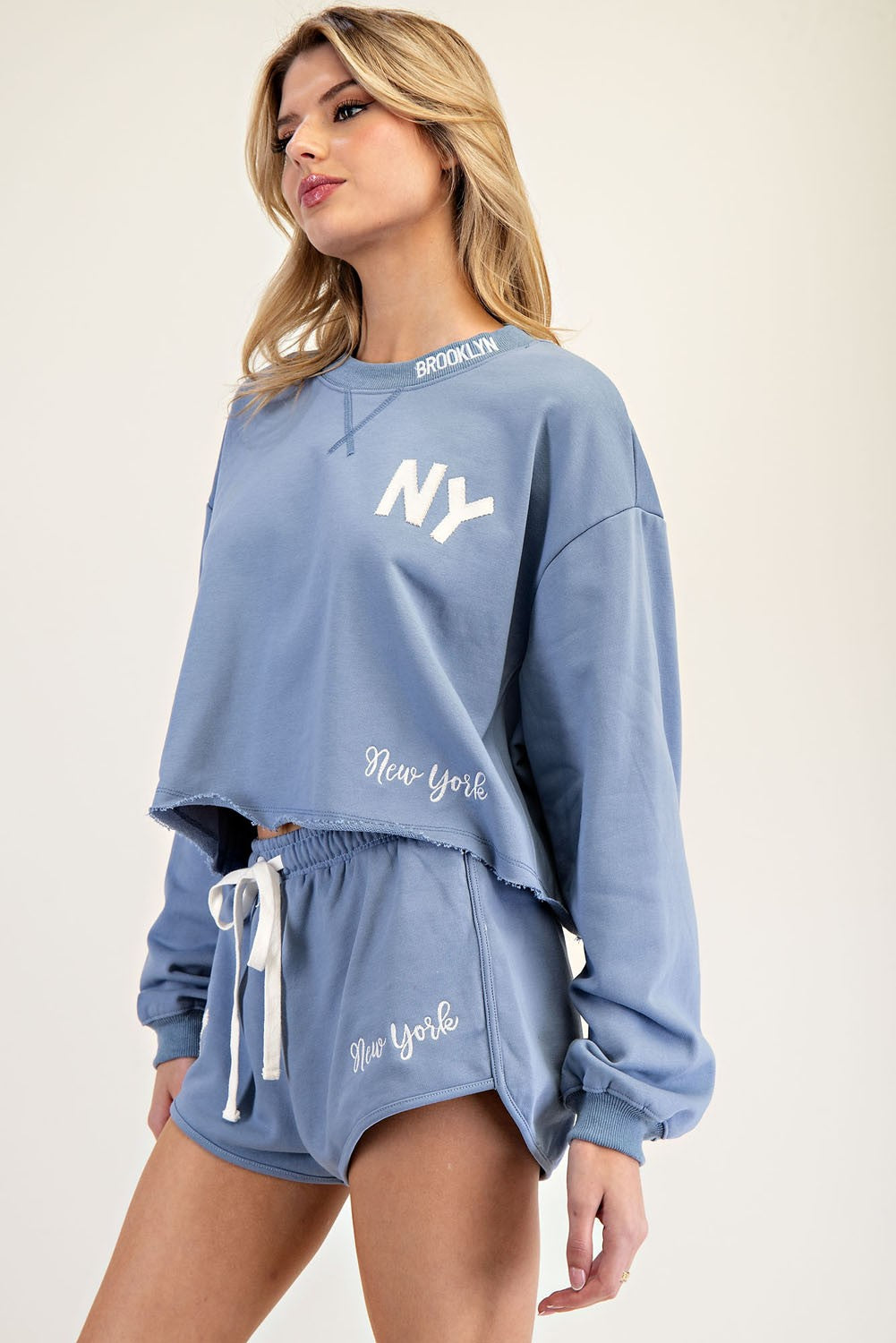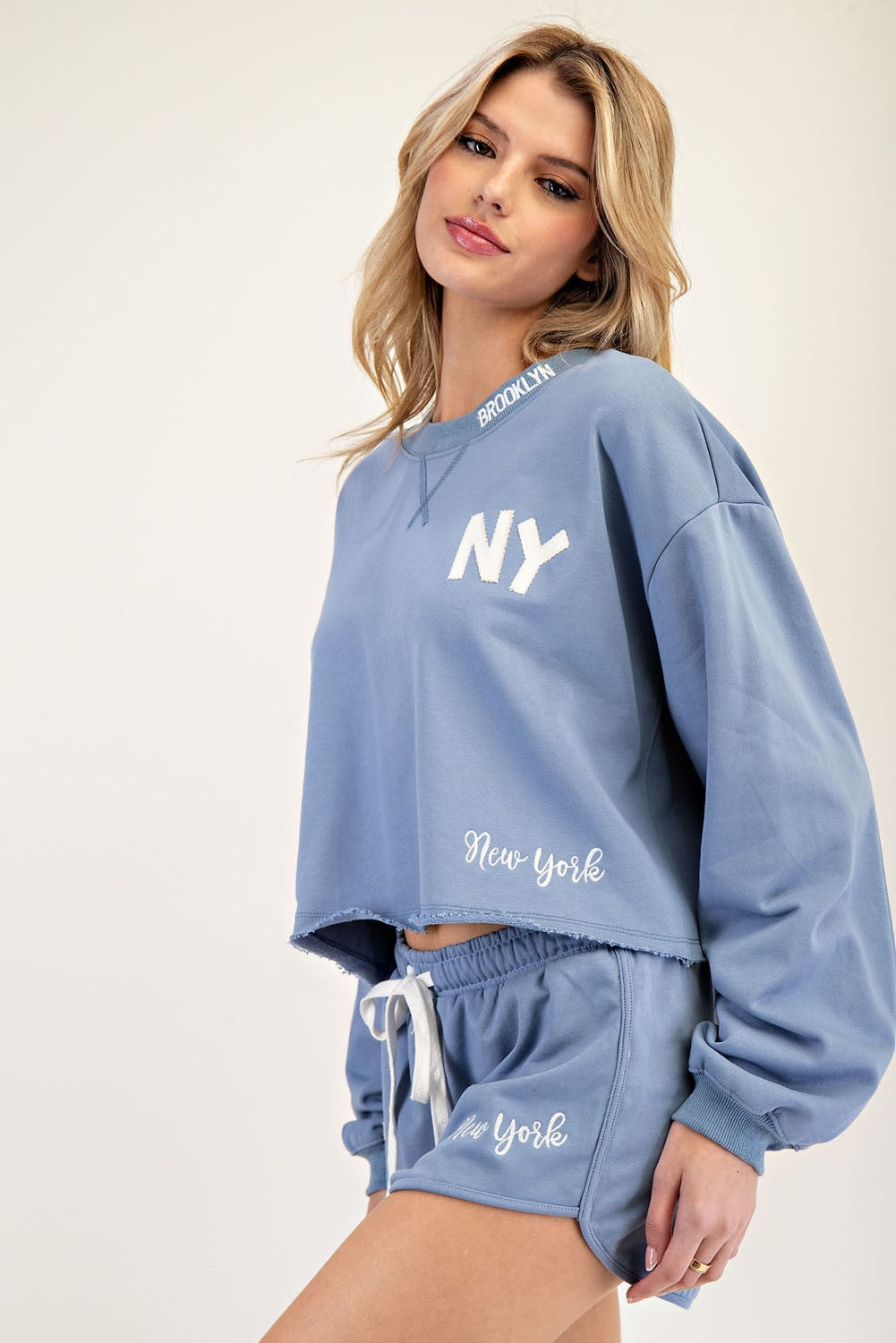 Long sleeve pullover top featuring a ribbed round neckline with Brooklyn text detailing, dropped shoulders, banded cuffs, NY text on the front, is a raw bottom hem and is a cropped length.