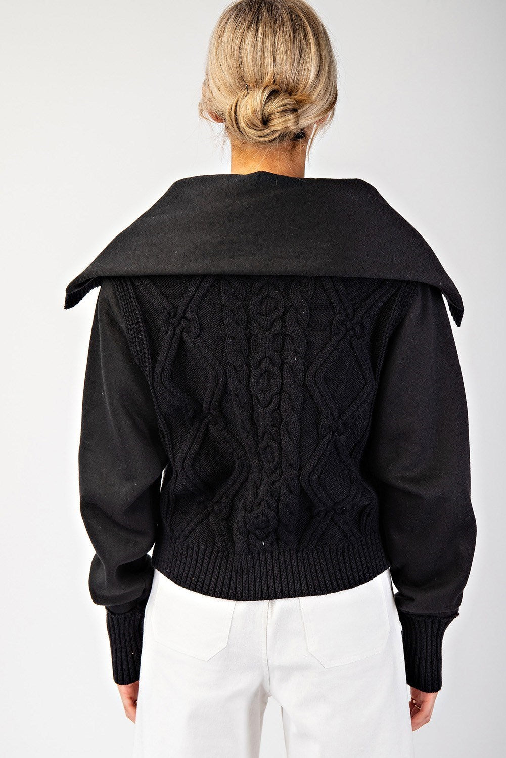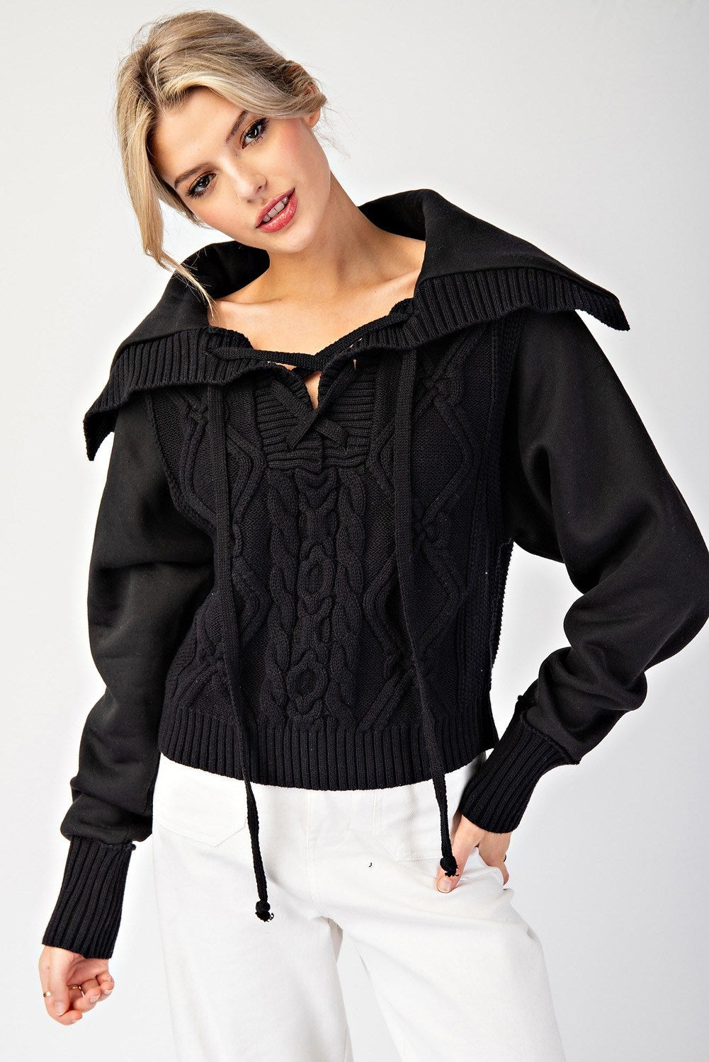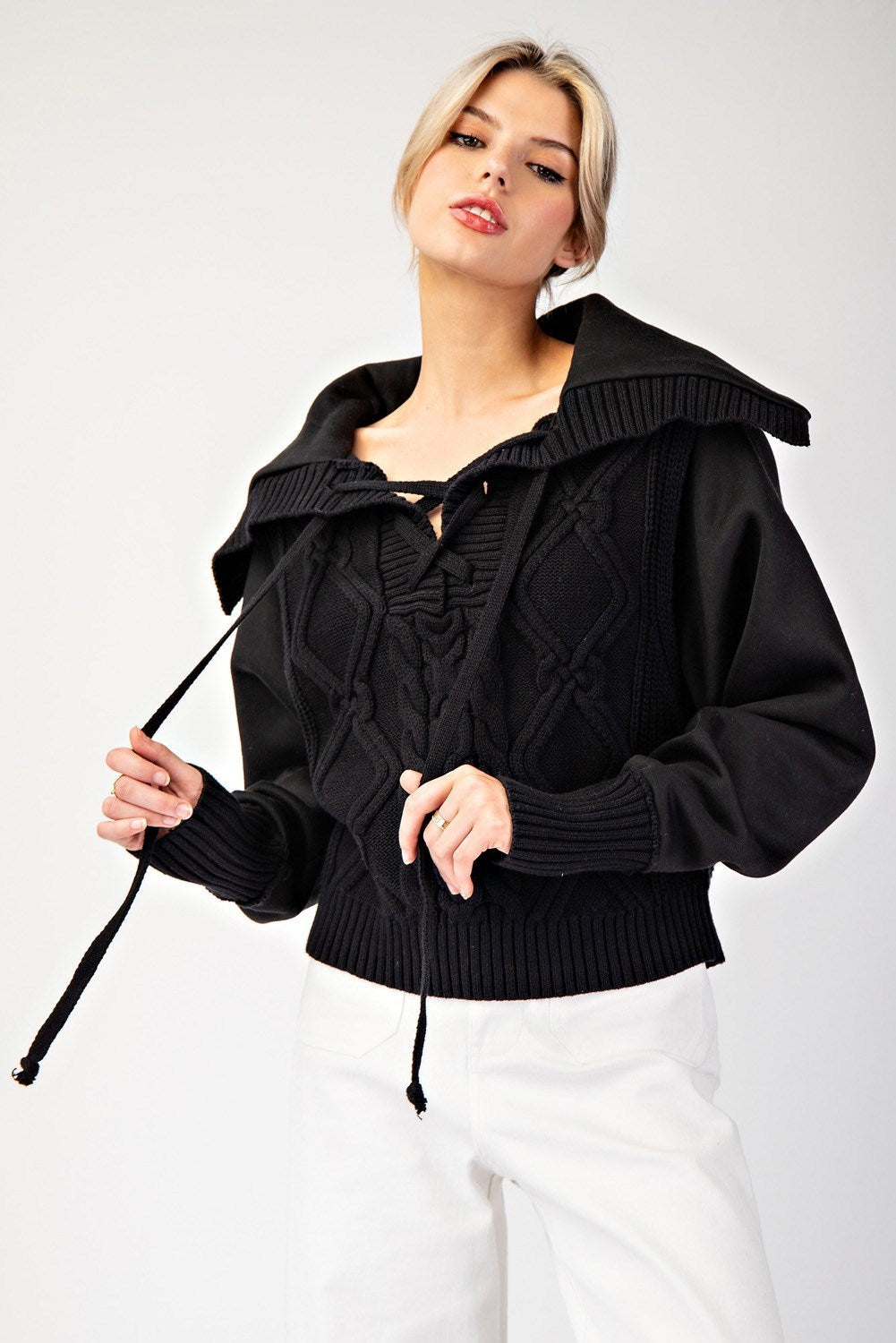 Textured long sleeve sweater top featuring a knit body, an oversized sailor hood with a lace up drawstring, a ribbed bottom band, ribbed cuffs and is a thicker fabrication.