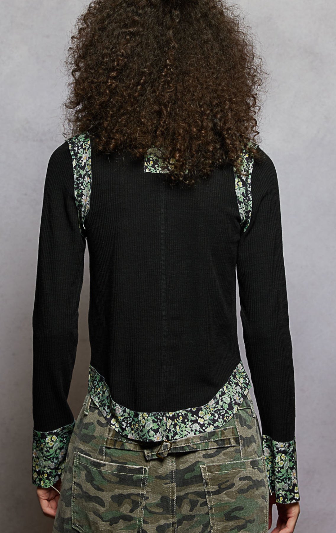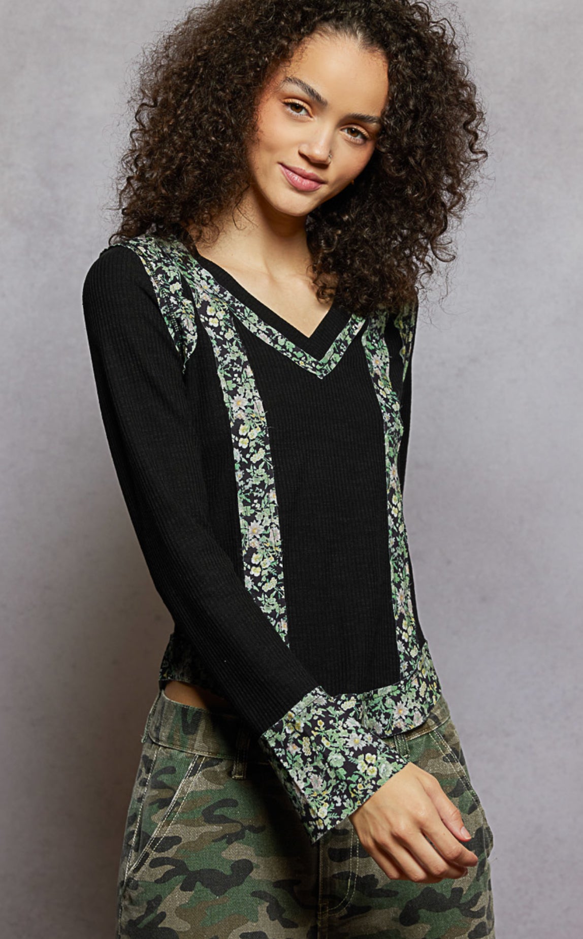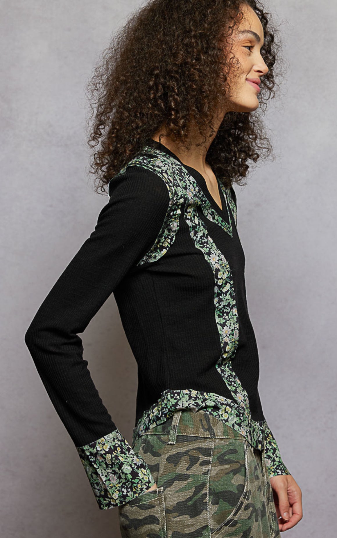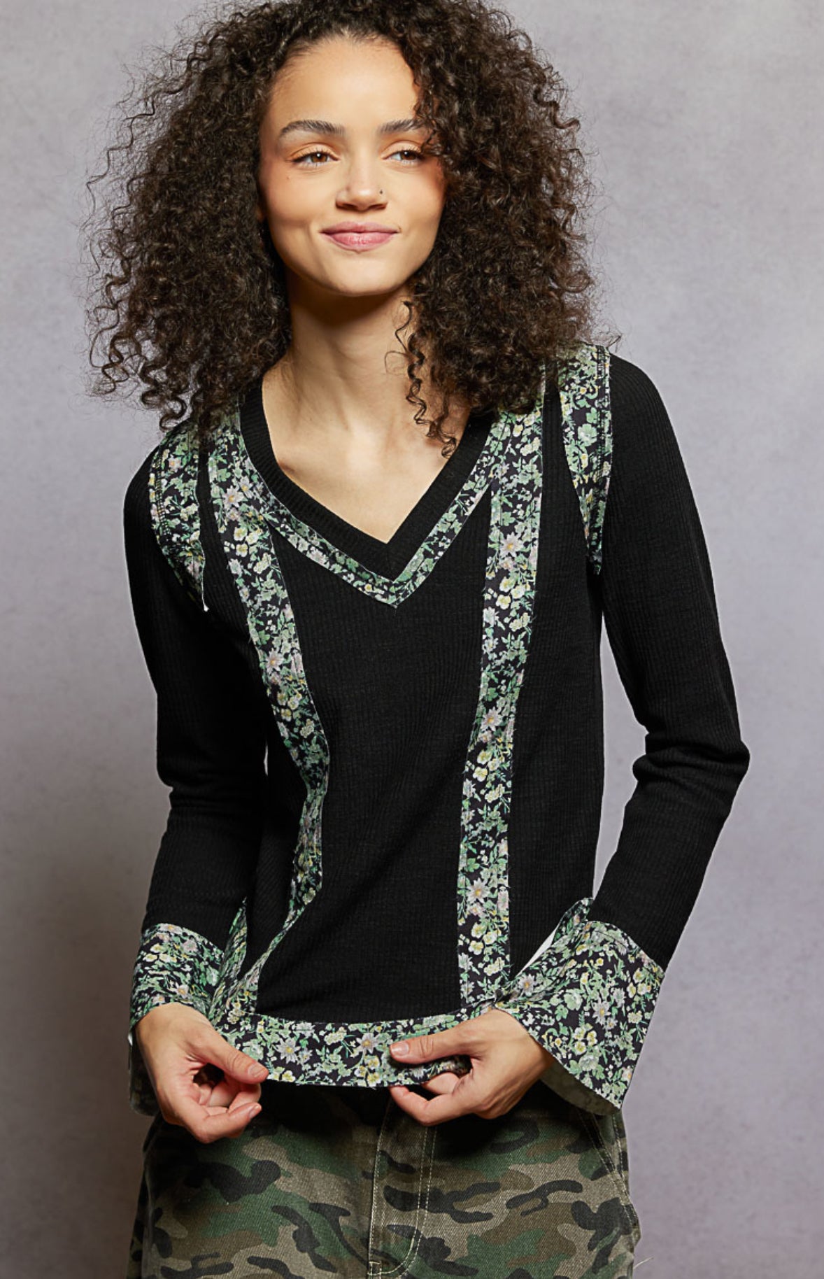 Designed in V-neck long sleeve regular fit top in rib with outseam, raw edge, print patch point, overlock stitch detail, sleeve ruffle point, vintage washing, solid color.