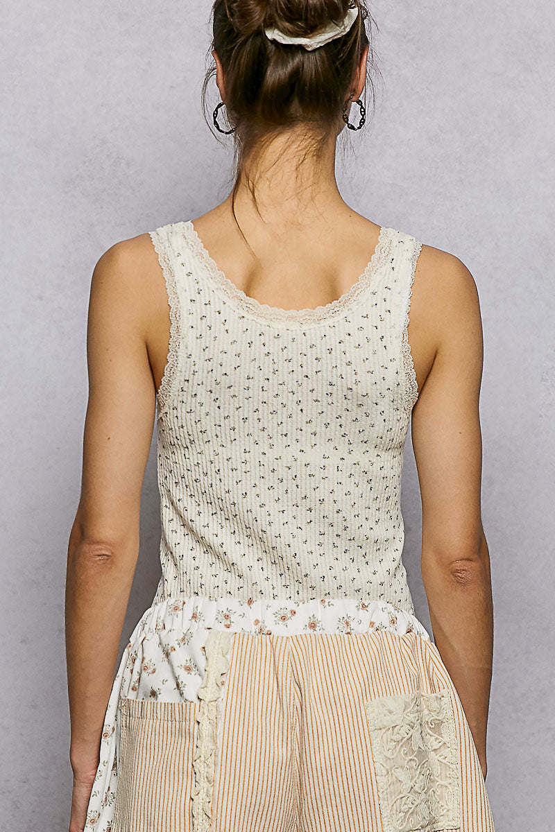 Sleeveless knit henley tank crafted with ribbed texture and an allover micro floral print. Designed with a scooped neckline trimmed in delicate lace, a button-front placket with contrast buttons, and a fitted silhouette that contours naturally to the body. Lightweight and breathable with subtle stretch, this versatile tank layers easily under jackets or stands on its own with bottoms for an easy, everyday look with feminine detail.
