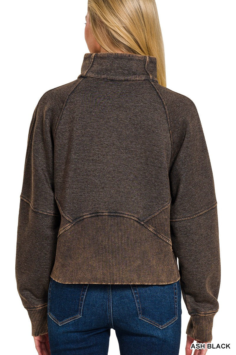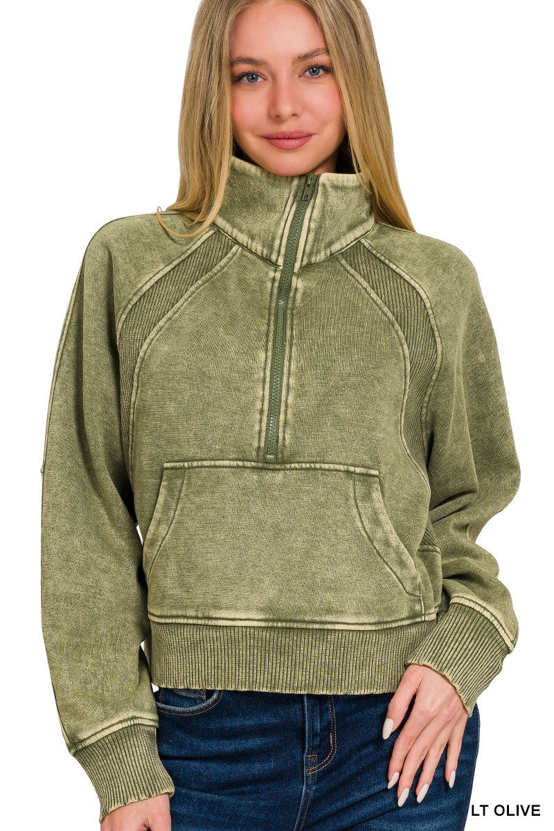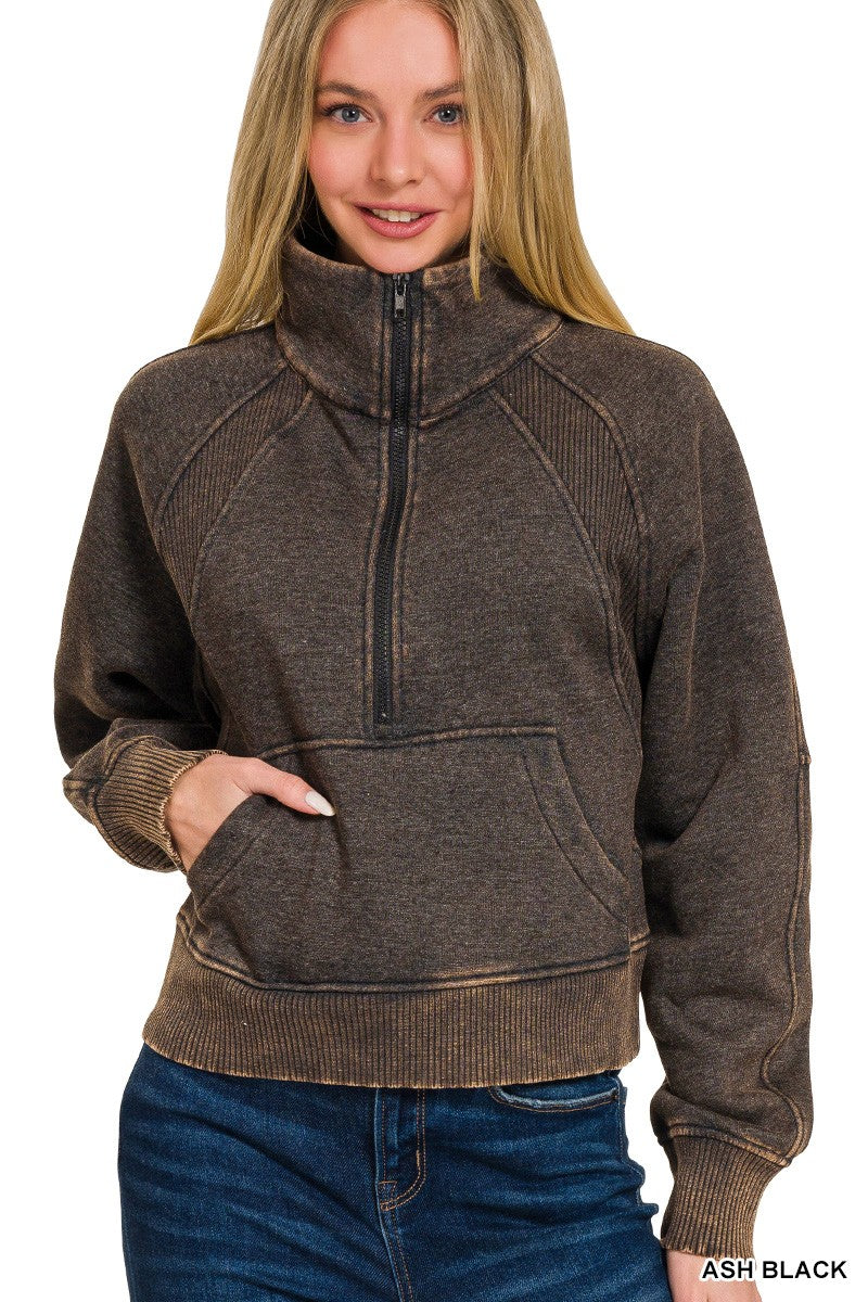 ACID WASHED HALF ZIP FLEECE PULLOVER KANGAROO POCKET