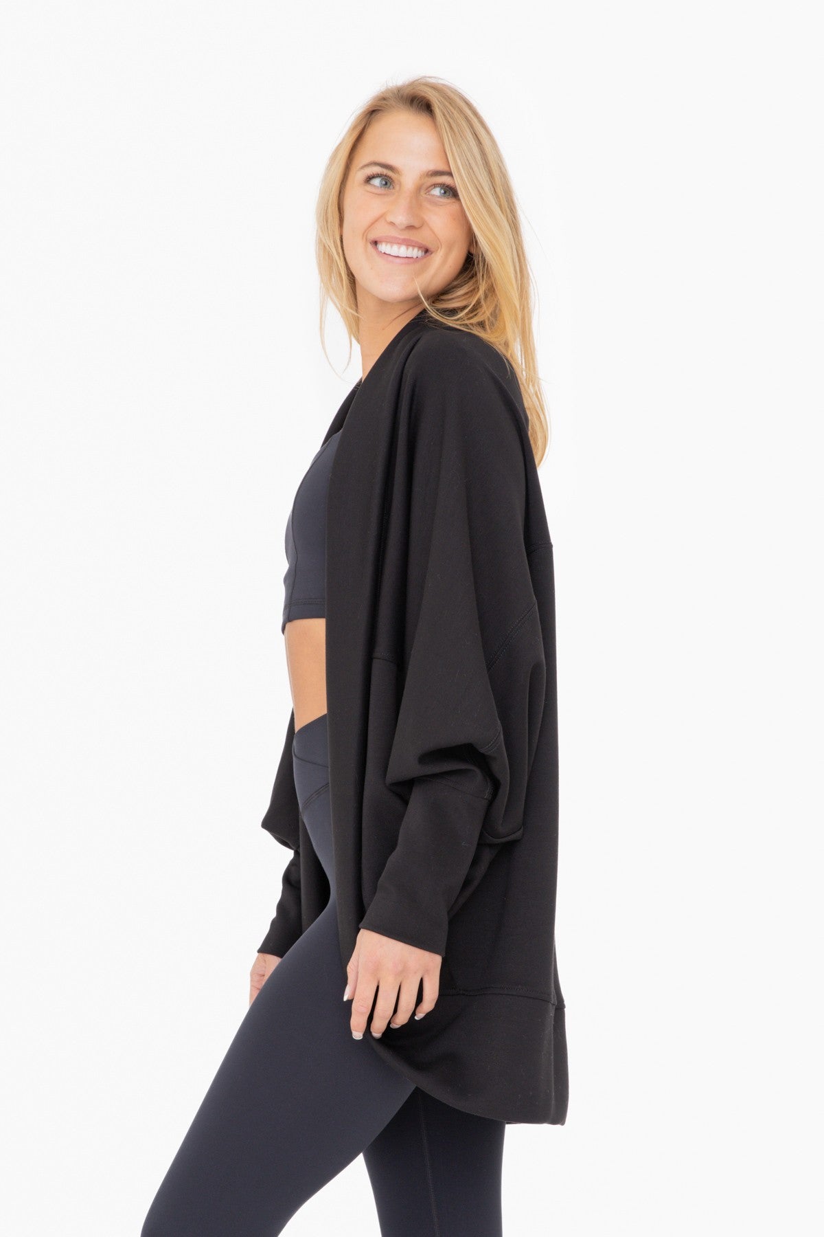 Best selling scuba fabric, this cocoon style cardigan is cute and cozy! It features extra long sleeve cuffs for a sleek look and has a light and spongey hand feel so you can wear it year round!