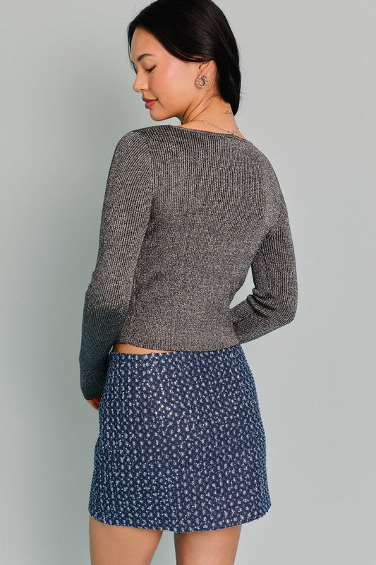 Shine in our Round Scooped Neck Long Sleeve Front Tie Ribbed Metallic Knit. This eye-catching top features a scooped neckline, long sleeves, and a front tie detail, all in a shimmering metallic ribbed knit for a standout look.