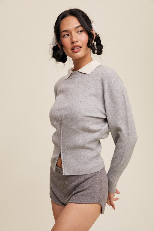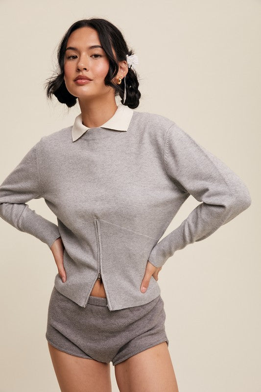 - Zipper slit fitted knit sweater - Crew neck - Long sleeve - Ribbed on neck, cuffs and hem - Zipper slit detail on center front hem - Model is 5' 7" 31-24-35 and wearing a size Small